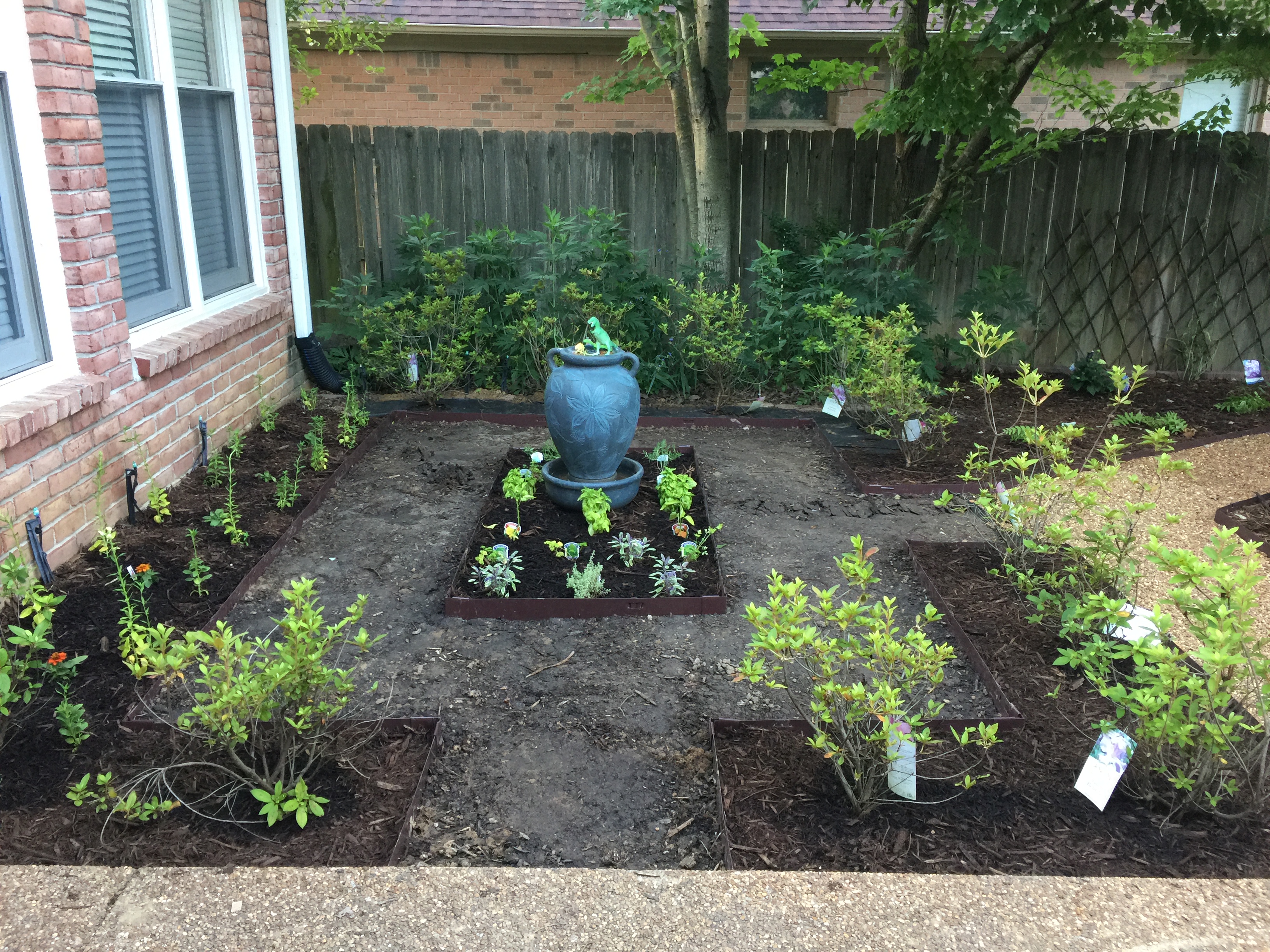Along the side next to the house, my wife wanted tall flowers and so those I planted as well. The finishing touch for this part of the garden was to carefully place in the center of the herb bed, the “dinosaur fountain,” so named by our oldest grandson.
