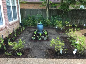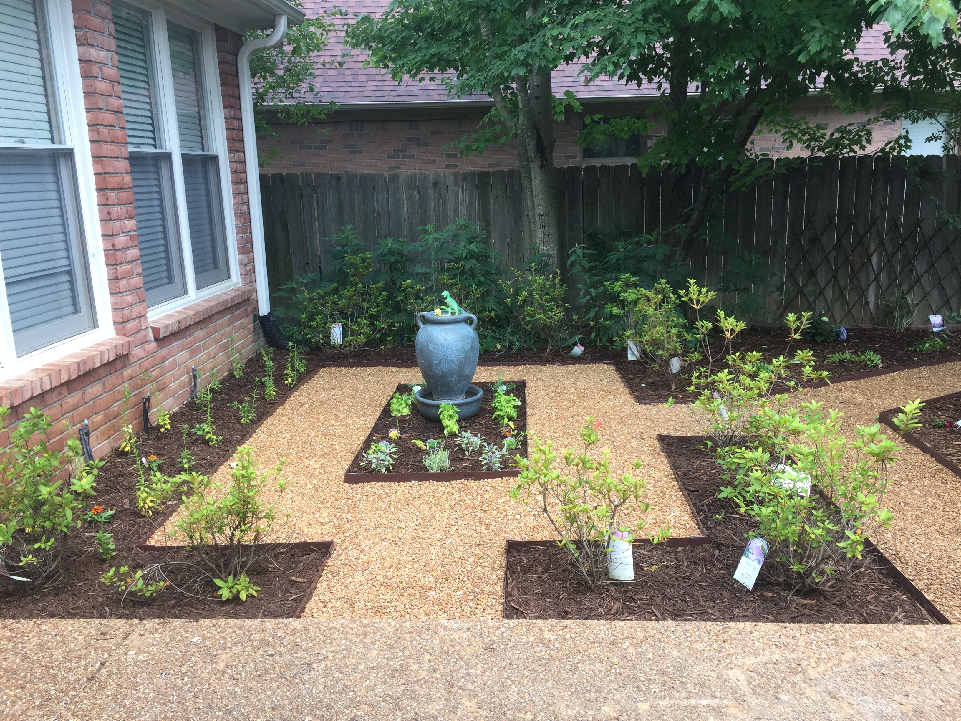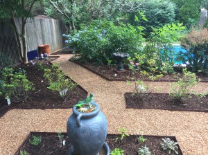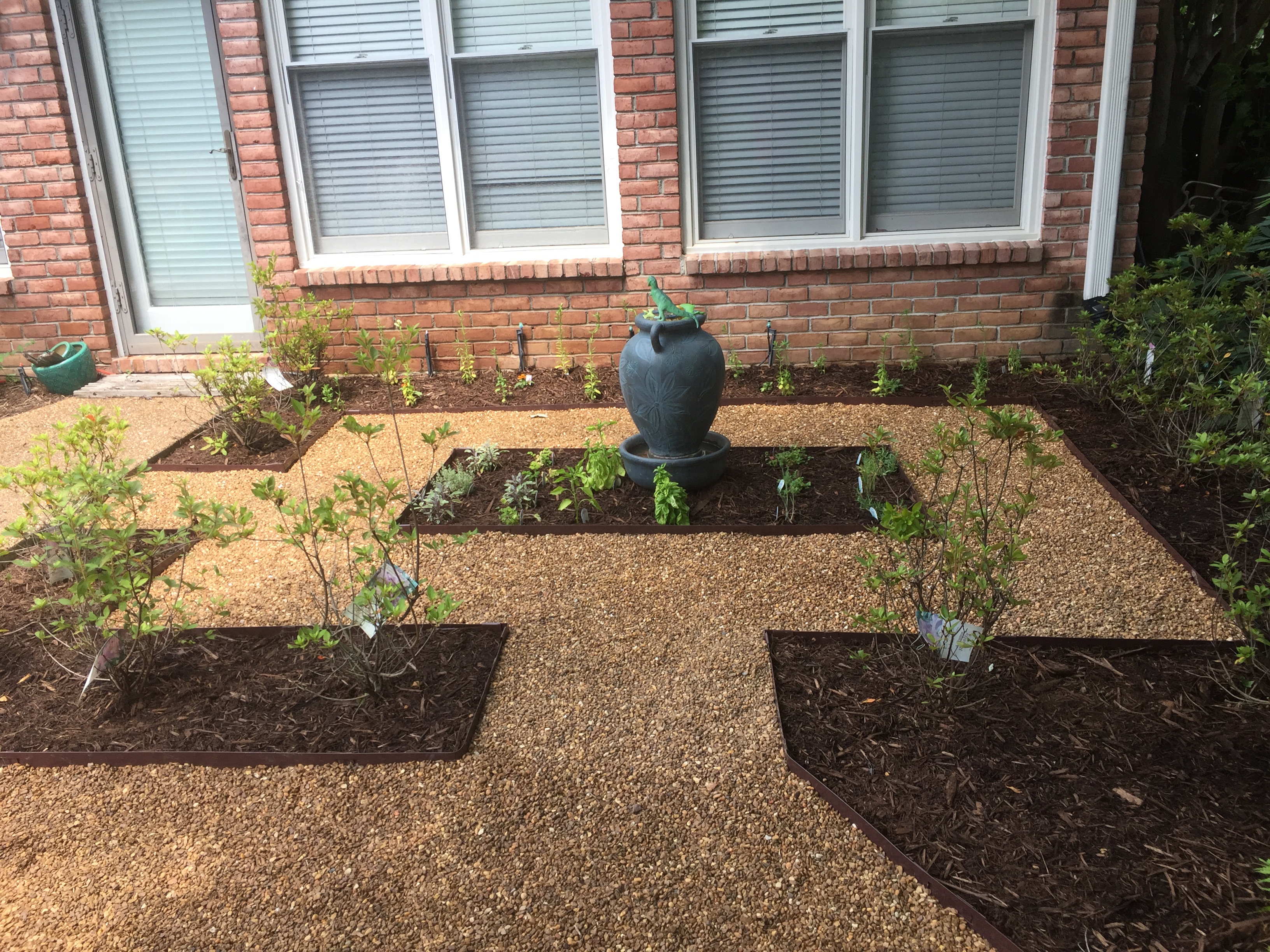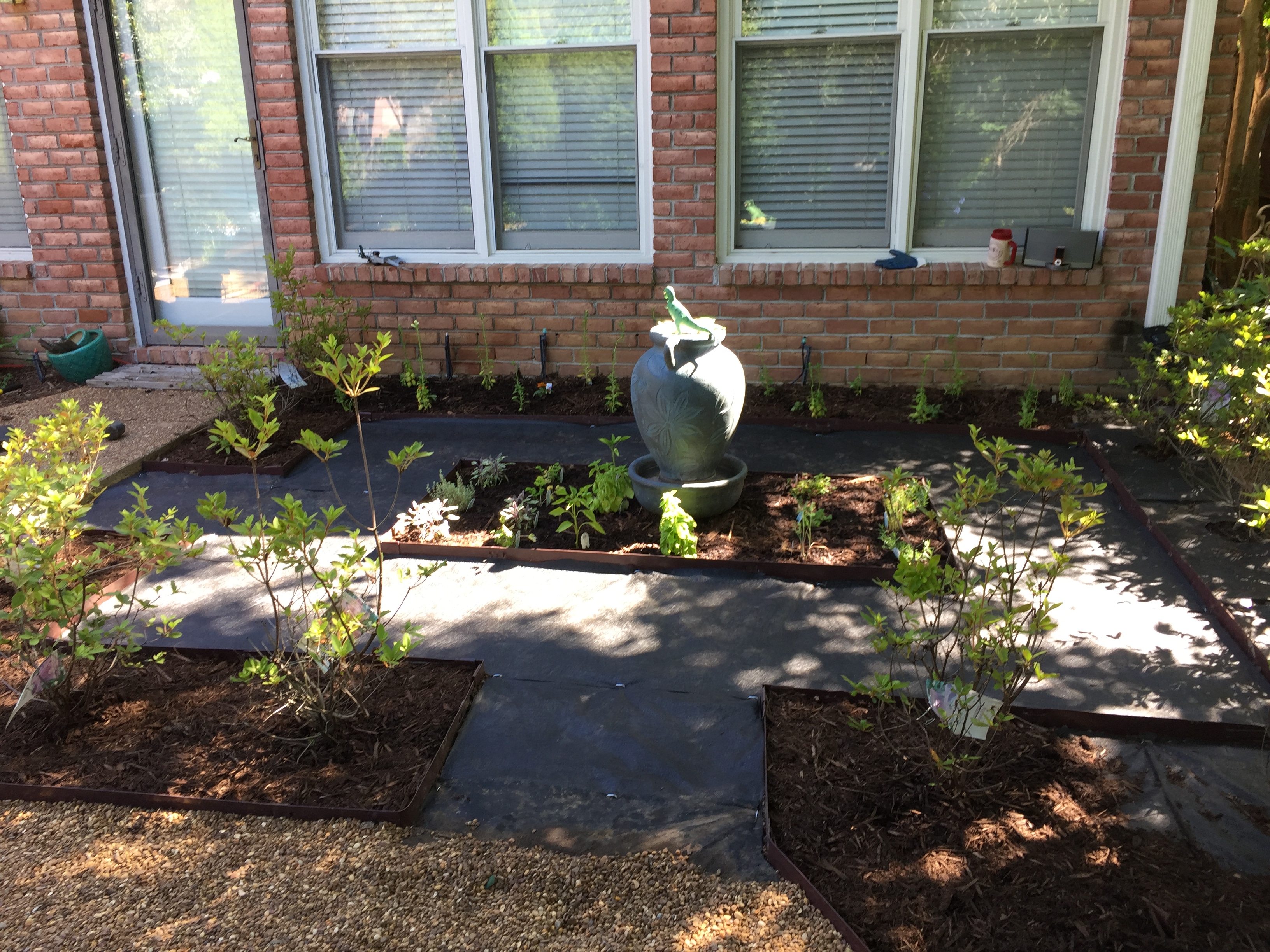 The last step was to finish mulching around the shrubs, lay down the landscape fabric on the walkways, and then add the pea gravel.