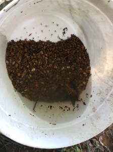 I figured I had three to four hundred dollars worth of pea gravel in the original design and so decided to recycle it. But it had to be washed of all the dirt, mulch, and weeds, one bucket at a time, a process made a bit easier by my youngest son’s suggestion of drilling many holes in the bottom of my bucket for the dirt to wash through. Turning the bucket on its side even allowed the floating wood mulch to be poured off.