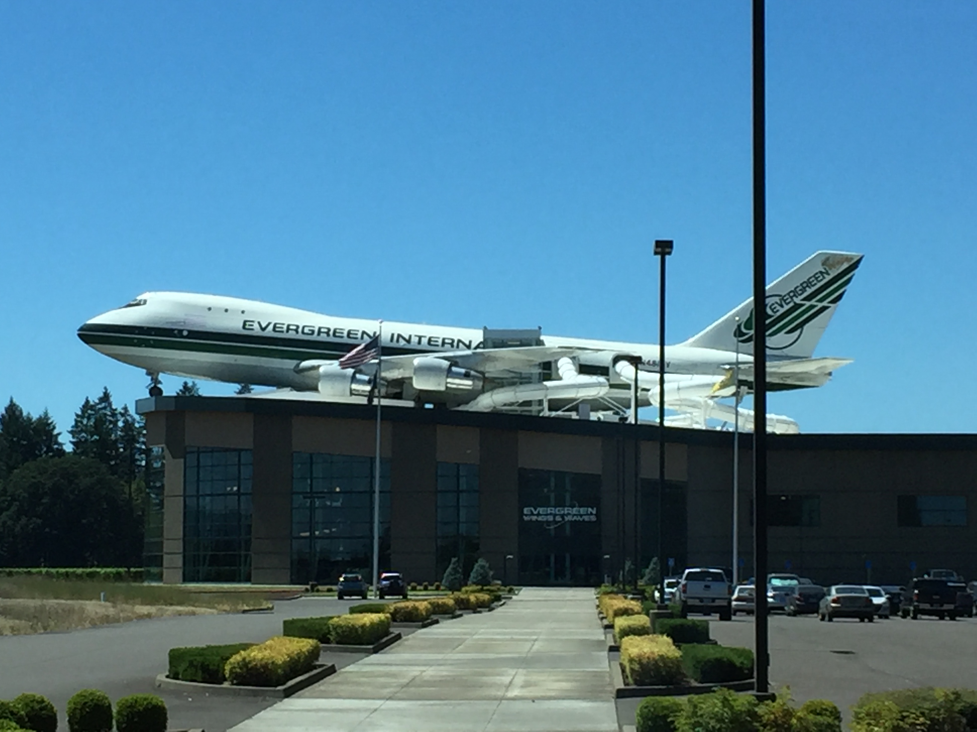 Not long after breakfast, we picked up our rental car and headed southwest to McMinnville, site of the Evergreen Air and Space Museum (easily recognizable by the 747 turned water slide parked on top of the building) and home of the Spruce Goose, the huge, all wooden plane built by Howard Hughes and his company during World War II.