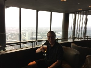 That night, our last in Atlanta, we ascended to the top of the Westin Peachtree hotel to view the sunset while enjoying some adult beverages. Only problem was the rain and clouds that had rolled in late in the day obscured the sunset until almost the last moment. But the beverages were still quite good.