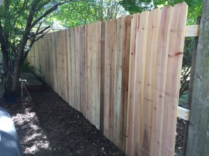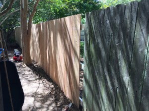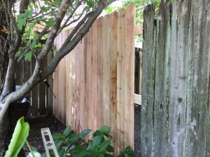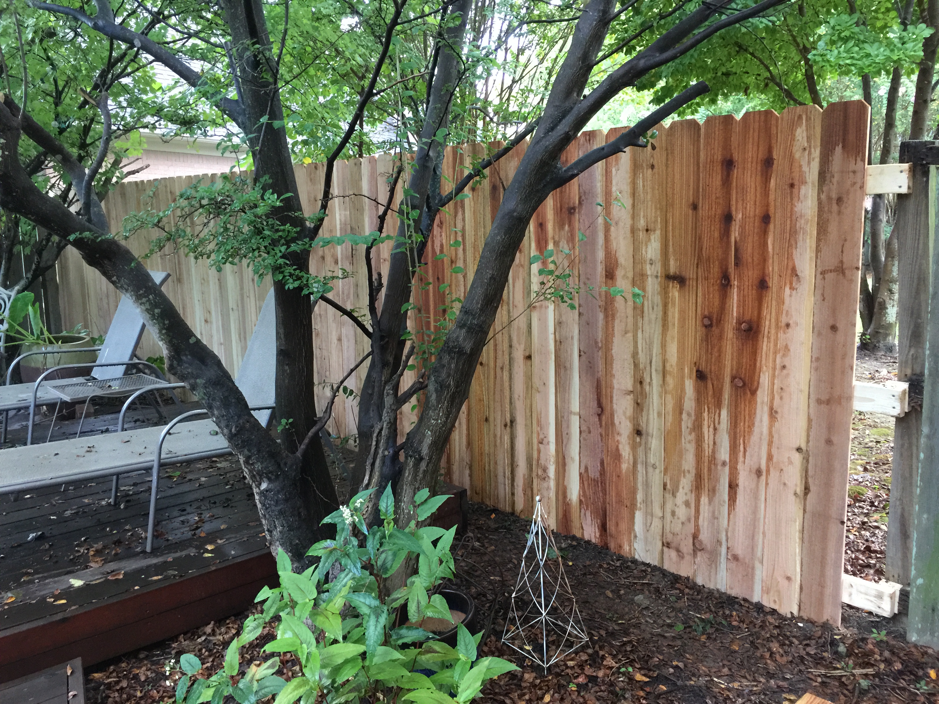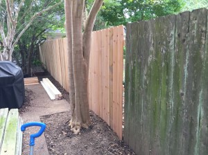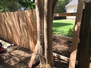 Second, I had trouble working around this almost 20-year-old crepe myrtle. The tree trunk had grown so large I had a very hard time using the nail gun to attach the fence boards. So several of the boards went in with the nails at an angle, a variation that hopefully won’t be too noticeable.