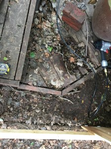 But I would learn more things as I went along in addition to having more frustrations. Like having finally gotten past the sprinkler head I kept tripping over, I don’t know how many times I stepped into this rotted portion of the deck (obviously another project on my list).