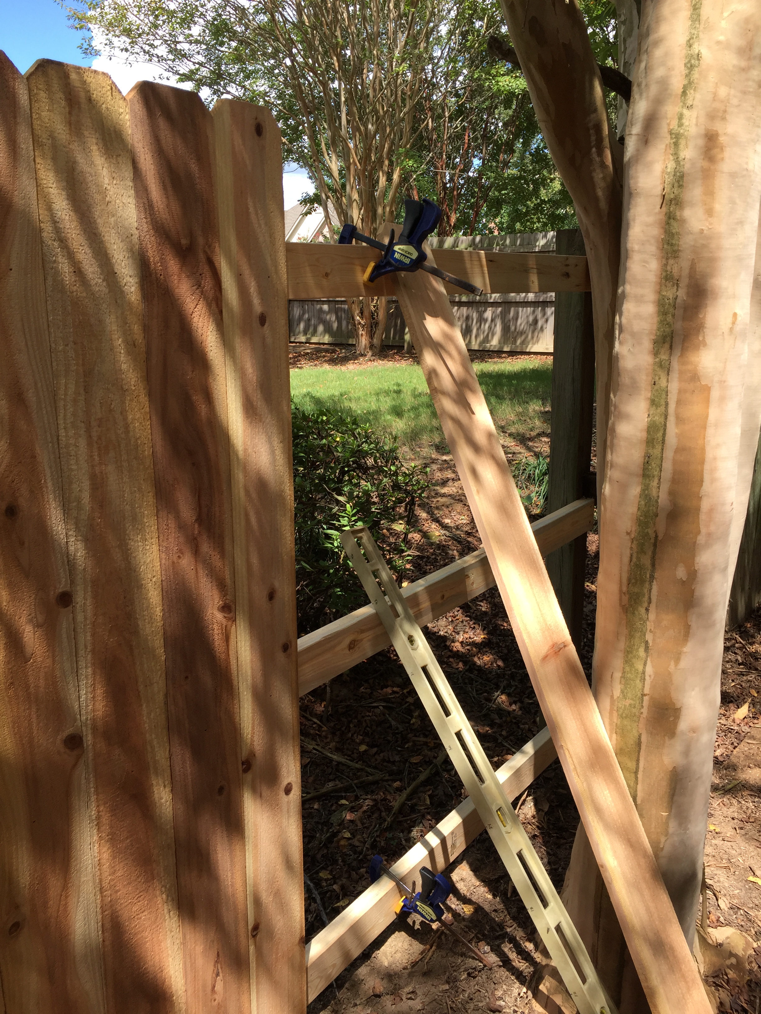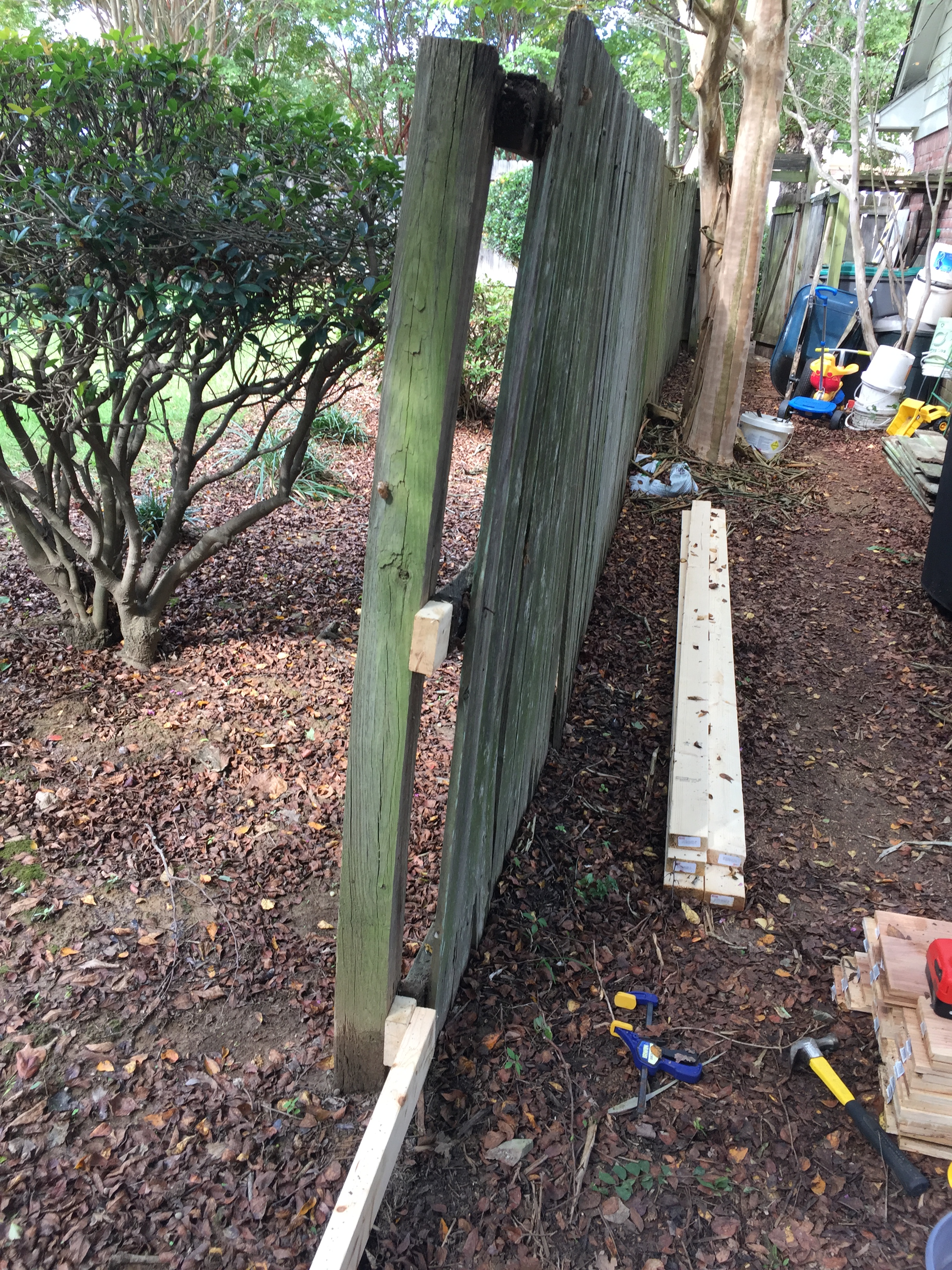 If I were fencing in the Leaning Tower of Pisa, this section would fit right in. Quickly realizing that replacing the post would add an extra two days to the job, I improvised and tacked on small sections of 2 X 4 at the bottom and middle of the warped post to which I would attach the cross beams. While it wouldn’t necessarily be aesthetically pleasing to my neighbor, it gave me a much less bowed fence section (although not completely plumb).