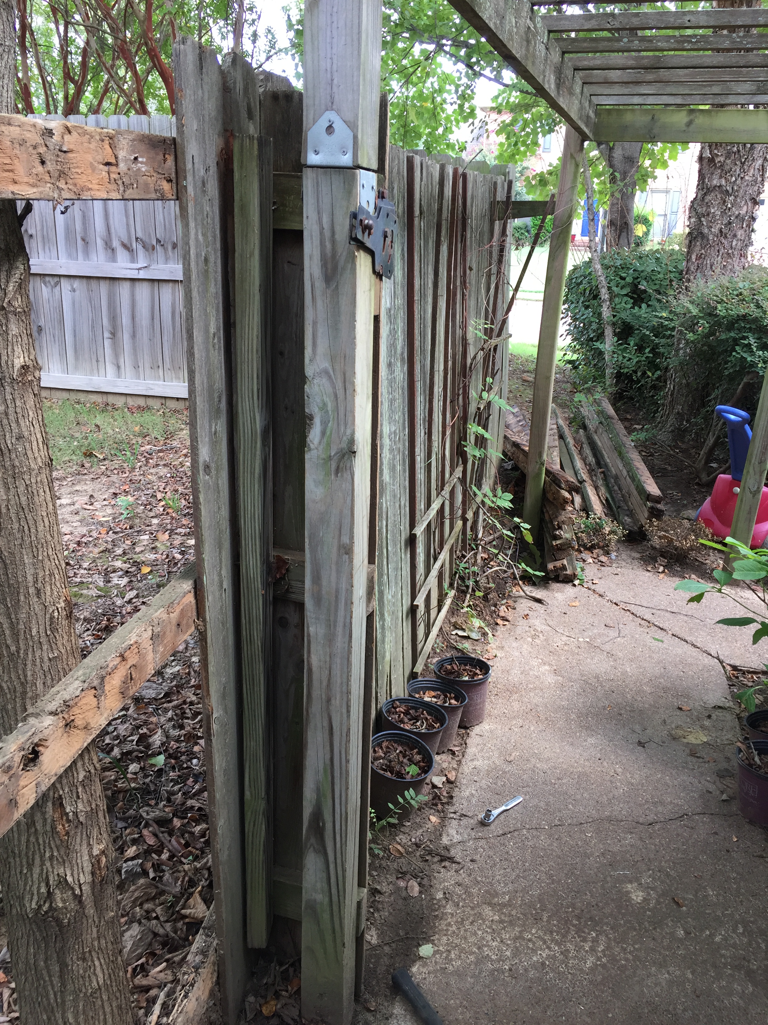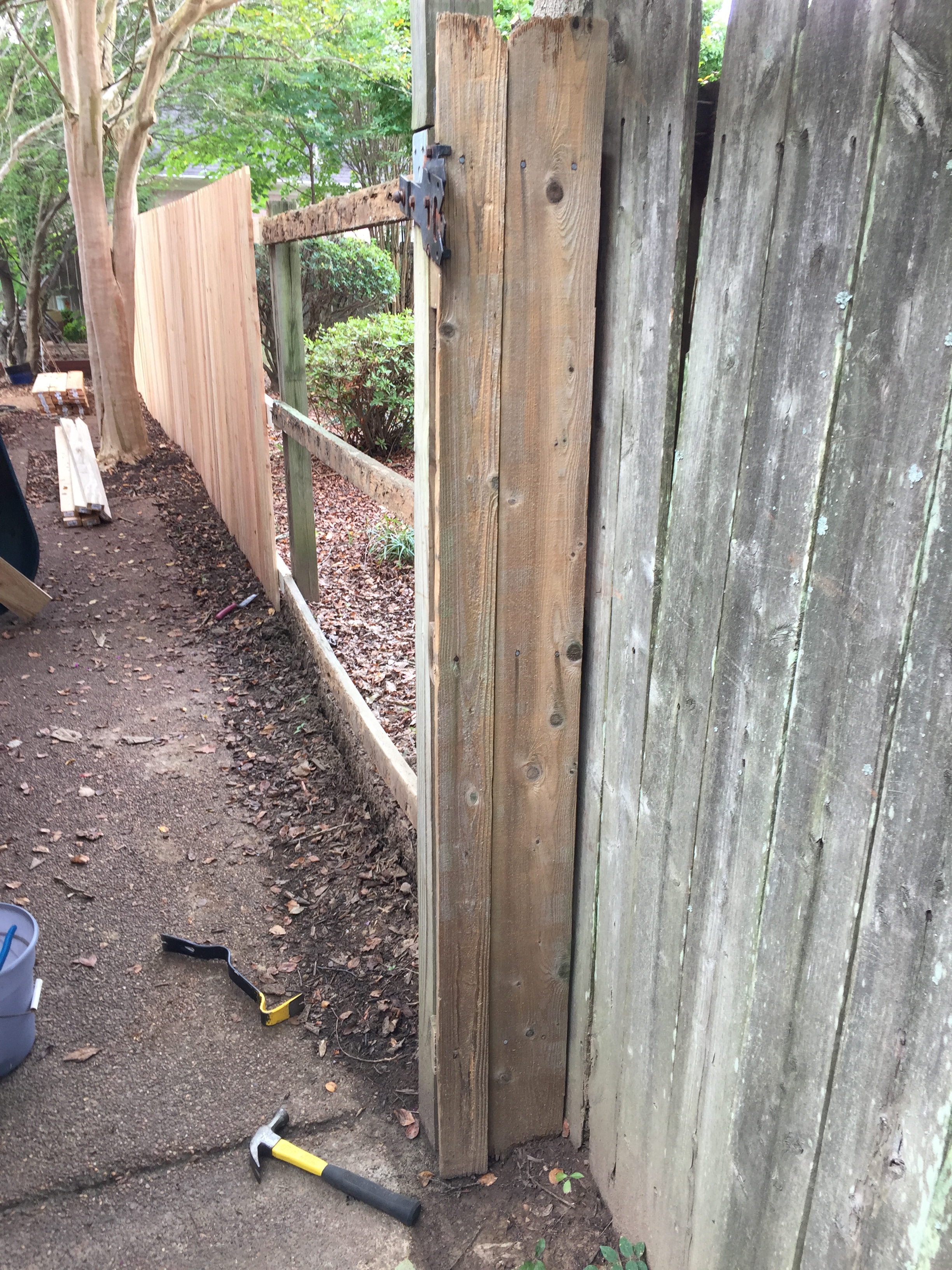 First, this section included the connection to the gate into the back yard.  When we had the pool installed in 2000, I had to take down the gate and so afterwards rebuilt it.  To secure the gate to the existing fence, I nailed a 2 X 4 into the existing fence board; this had to be removed…