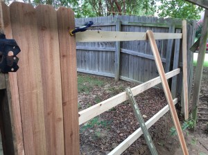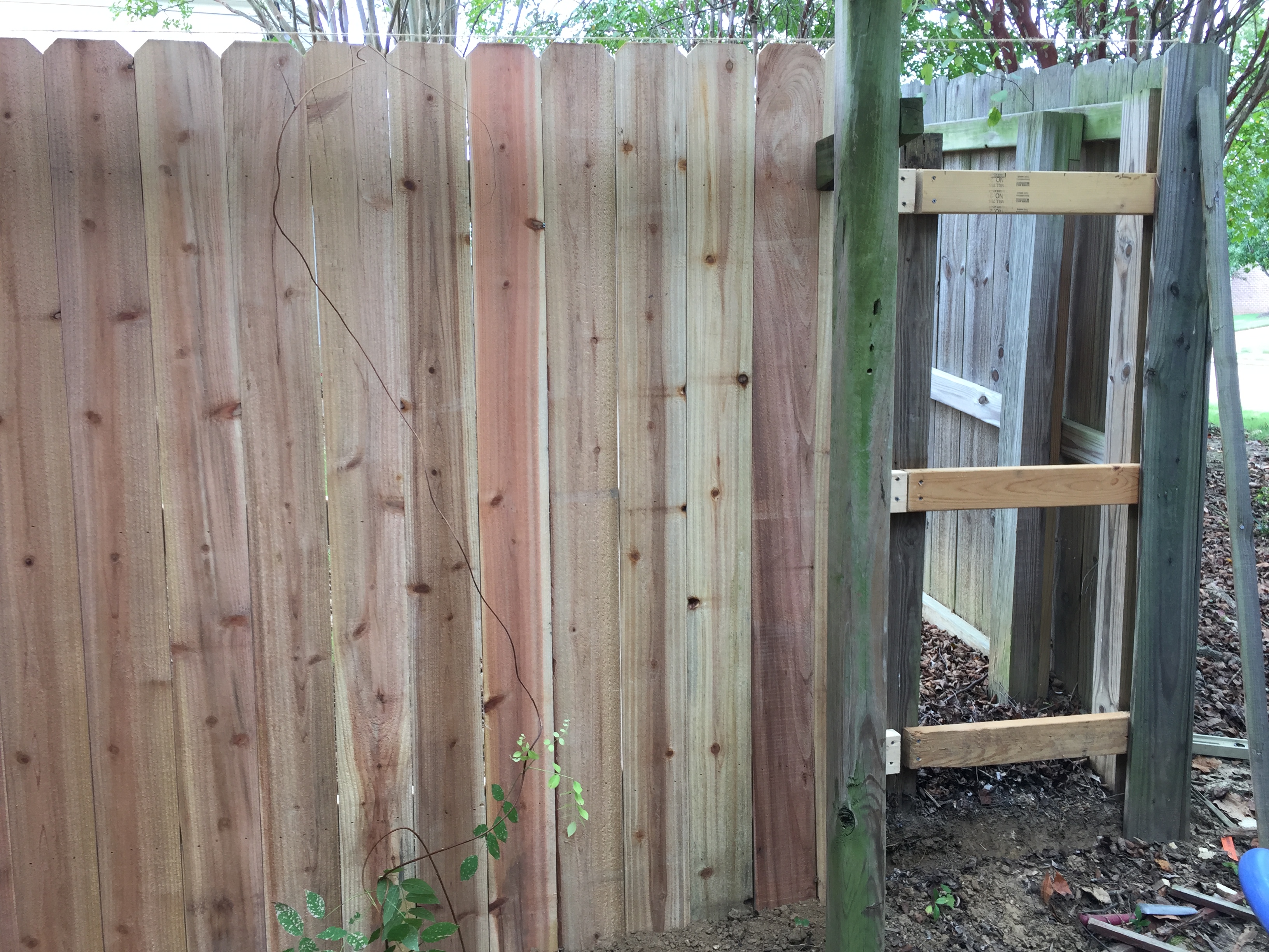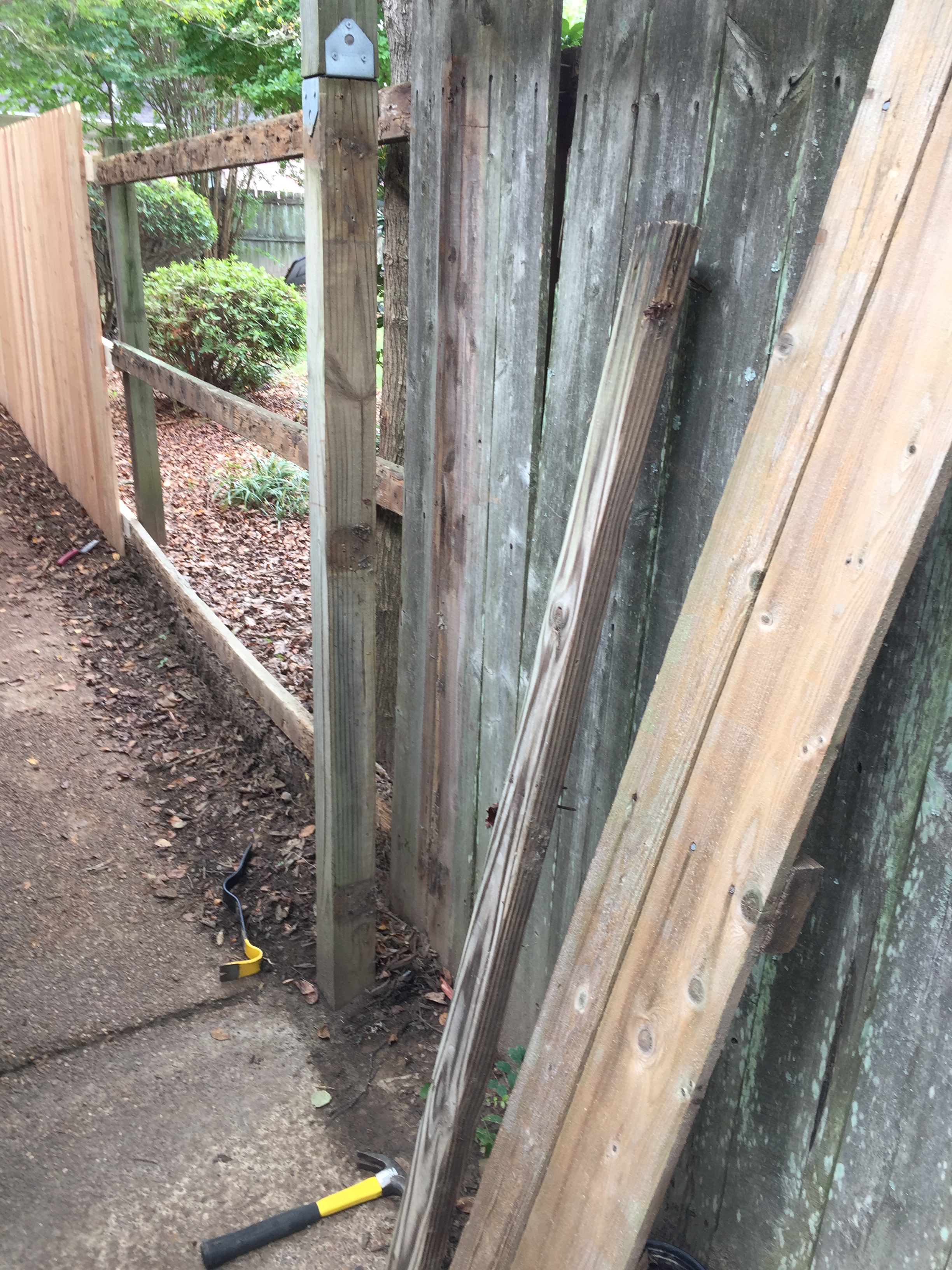 When I took down this last section, I found that there was actually another short section about 24 inches long that I didn’t realize was there.  I had not accounted for this in my crossbeams purchase but fortunately I had enough old 2 X 4s lying around the house that I could use.  But somehow it made my fence board counts off as well and so back to Lowe’s I went for a few more boards.