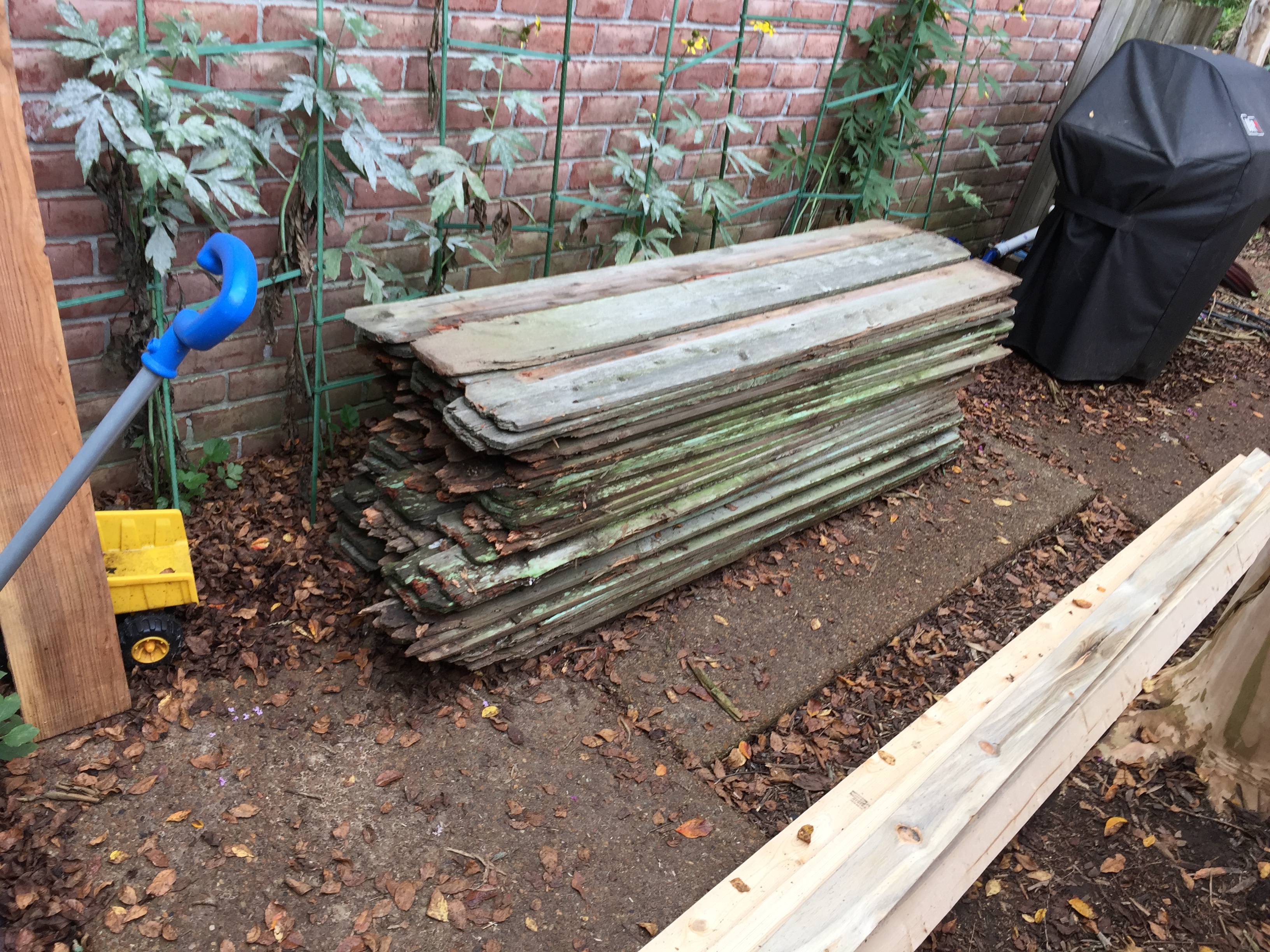 It just so happened that day we were having the wooden floor replaced in our bedroom (a long story for another day) and when one of the workers came outside to admire my work, he asked me what I was going to do with the old wood (he even asked me if I installed fences for a living).  I told him I was just going to throw them all away to which he replied he’d be happy to haul it off with our old bedroom floor as well.  Problem solved!
