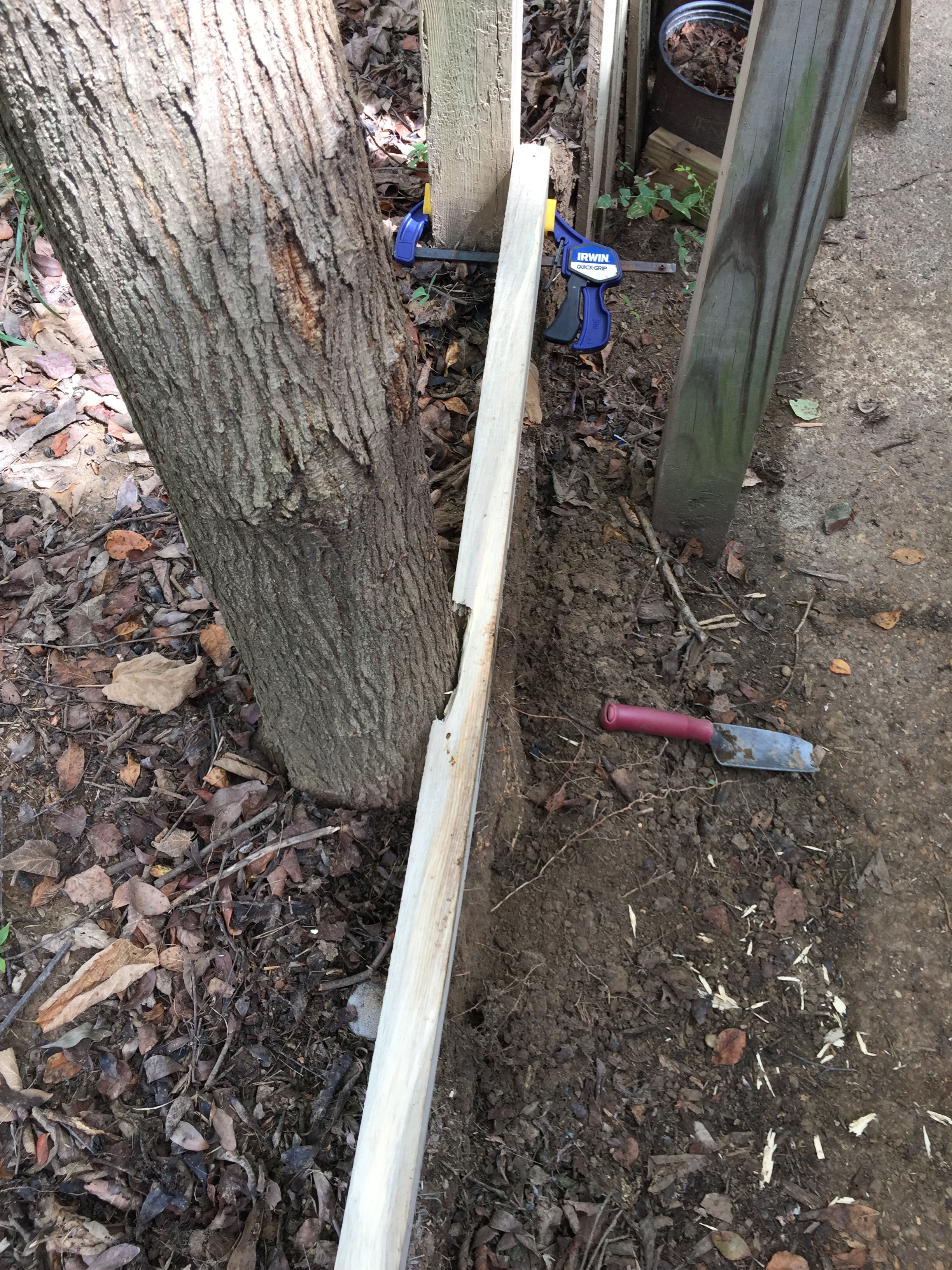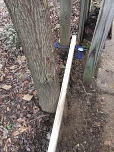 This tree was apparently not there when the fence was built but over the years, this volunteer apparently took root and grew up right next to the fence.  When I went to install the bottom cross beam, it wouldn’t mate to the post because of the width of the trunk.  I pondered my different options for a while and finally decided not to pull a George Washington and chop down the tree but rather to notch my crossbeam.