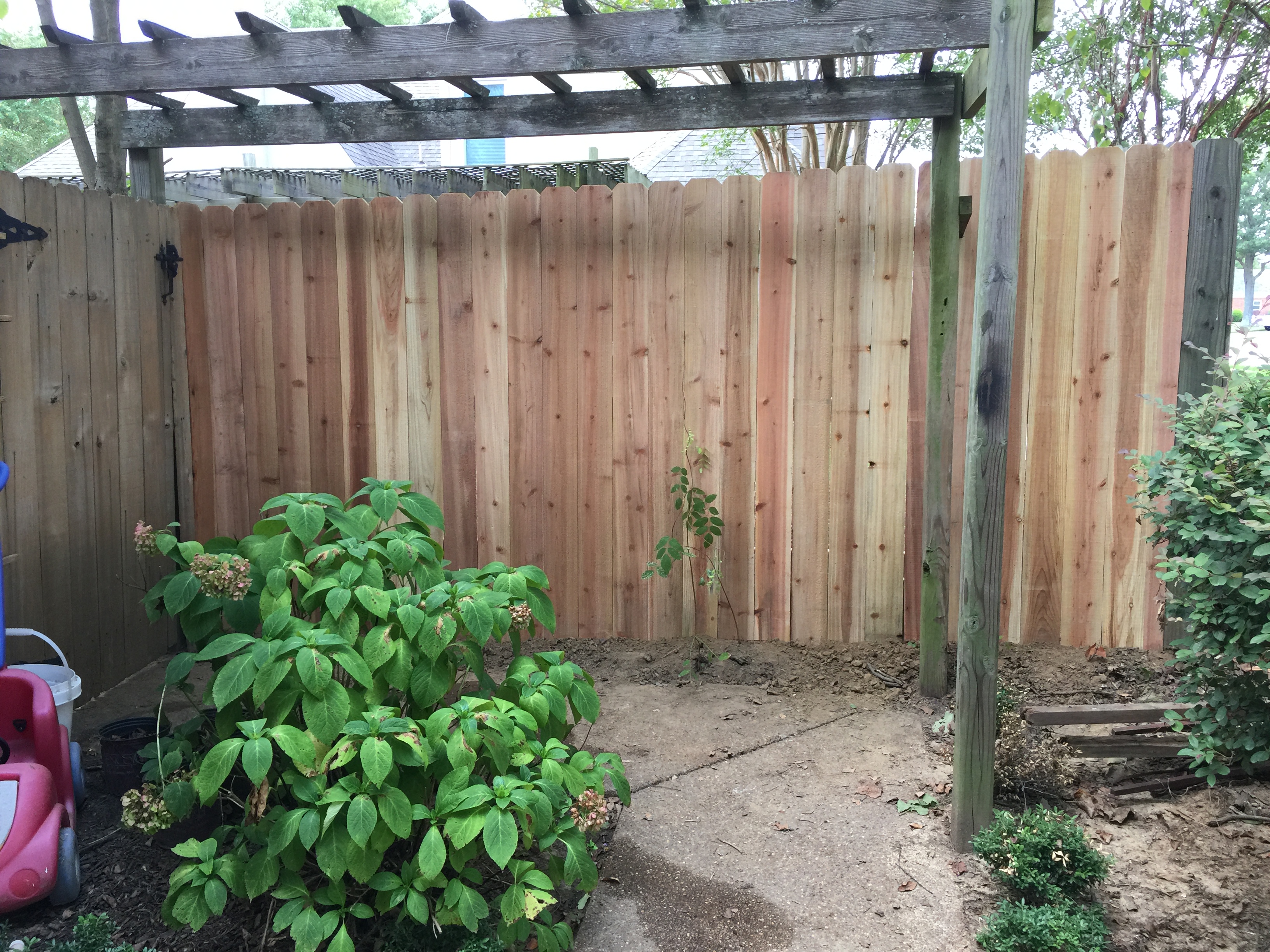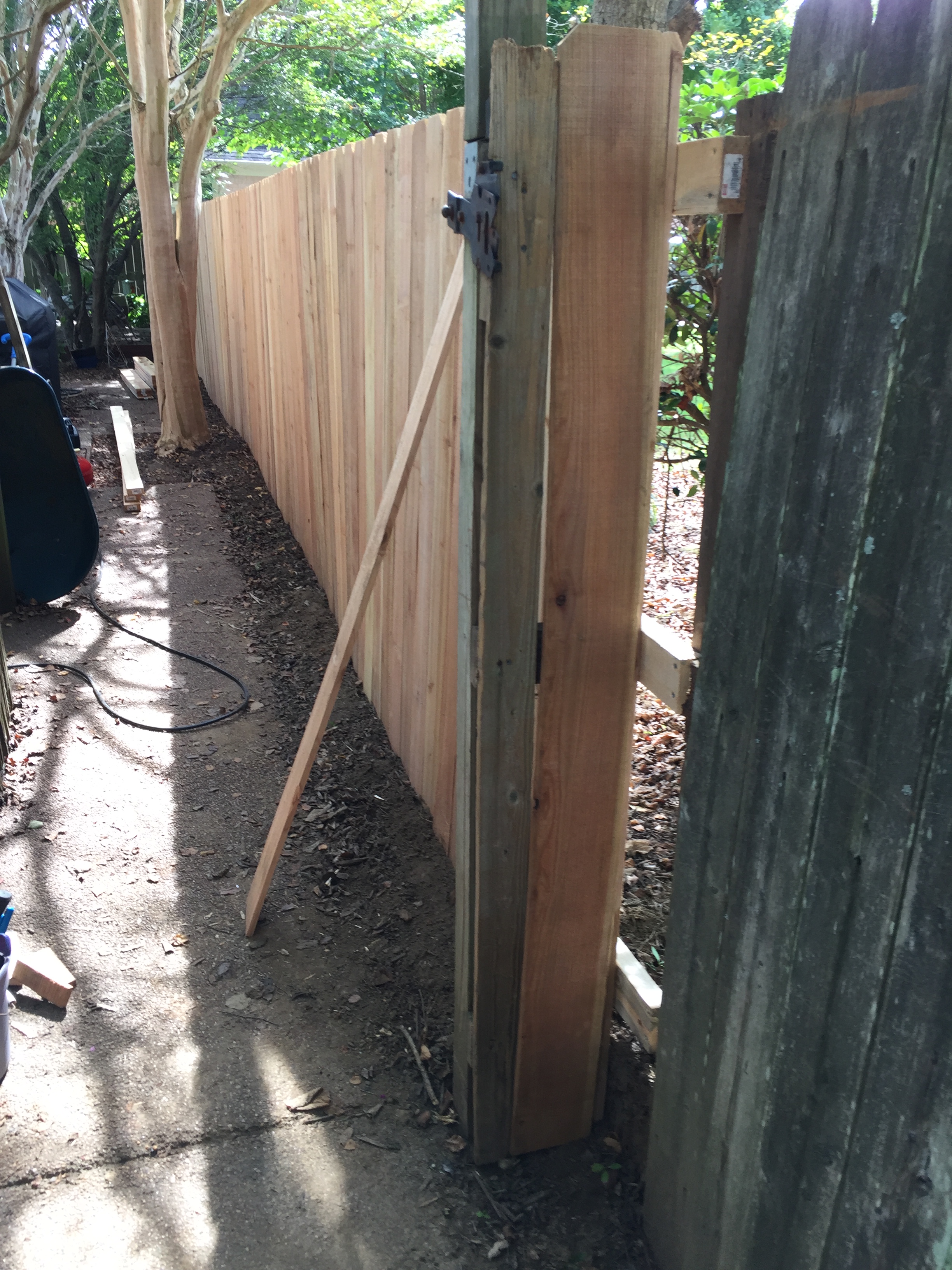 When I got to the eighth and final section, I really felt like I was in the home stretch and optimistic that I would finish the fence before I headed out of town.  As I removed the old fence boards, I saw that my neighbor’s yard had increased in elevation about eight inches over the 20+ years my fence had been in place.  When my neighbor had their fence replaced, which mated to my old one at the front corner, it had been installed at this new higher elevation, which meant at the corner of our property, their fence was about eight inches taller than mine. I considered several options and in the end decided to run a string from the top of my last fence section by the gate to the top of their fence achieving a slight increase in fence height over the 10 foot section (seen at the top of the photo below).