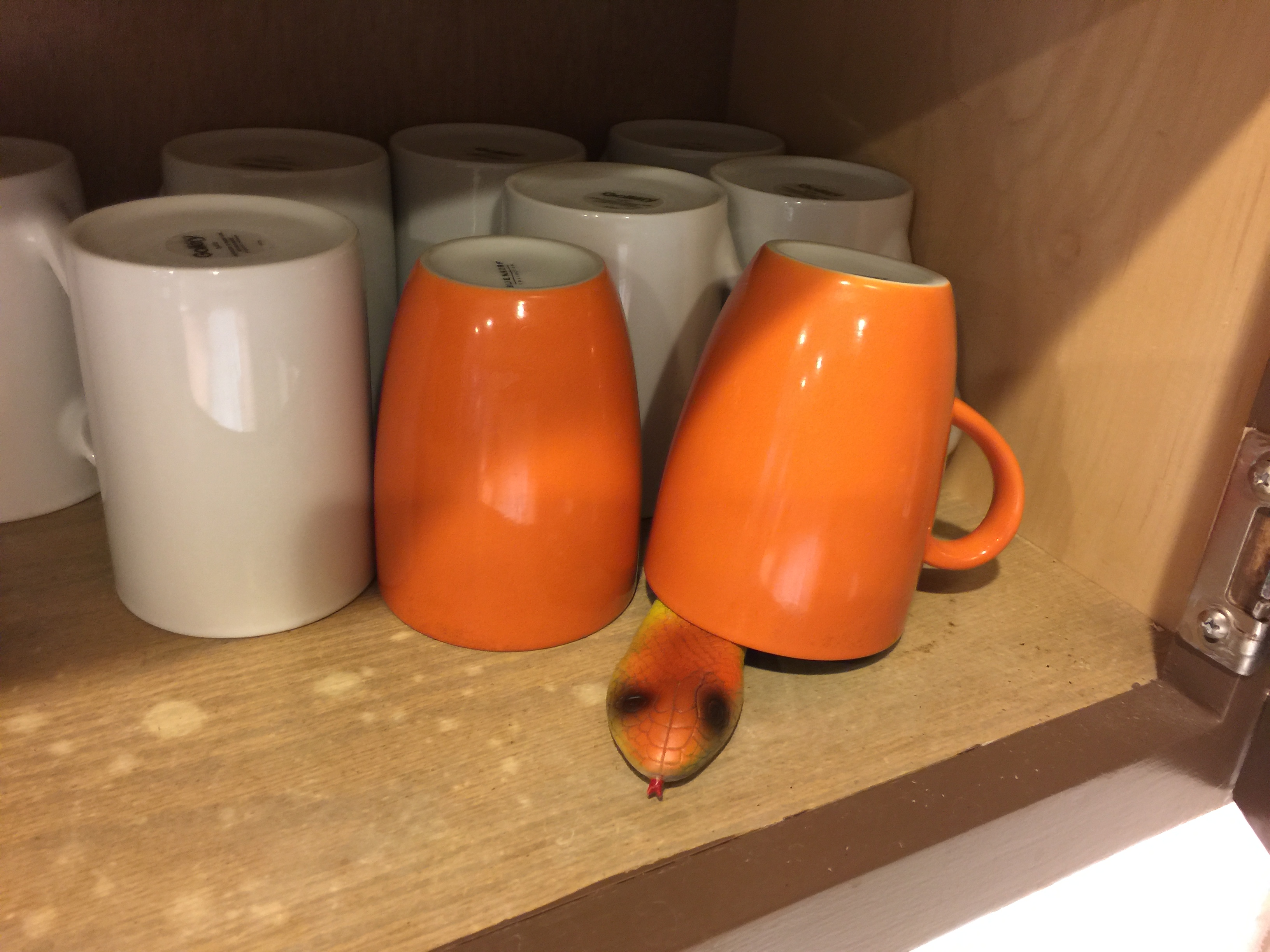 It started out with either my wife or me placing the snake in an unsuspecting place whereupon the other of us would happen upon it in our every day life.