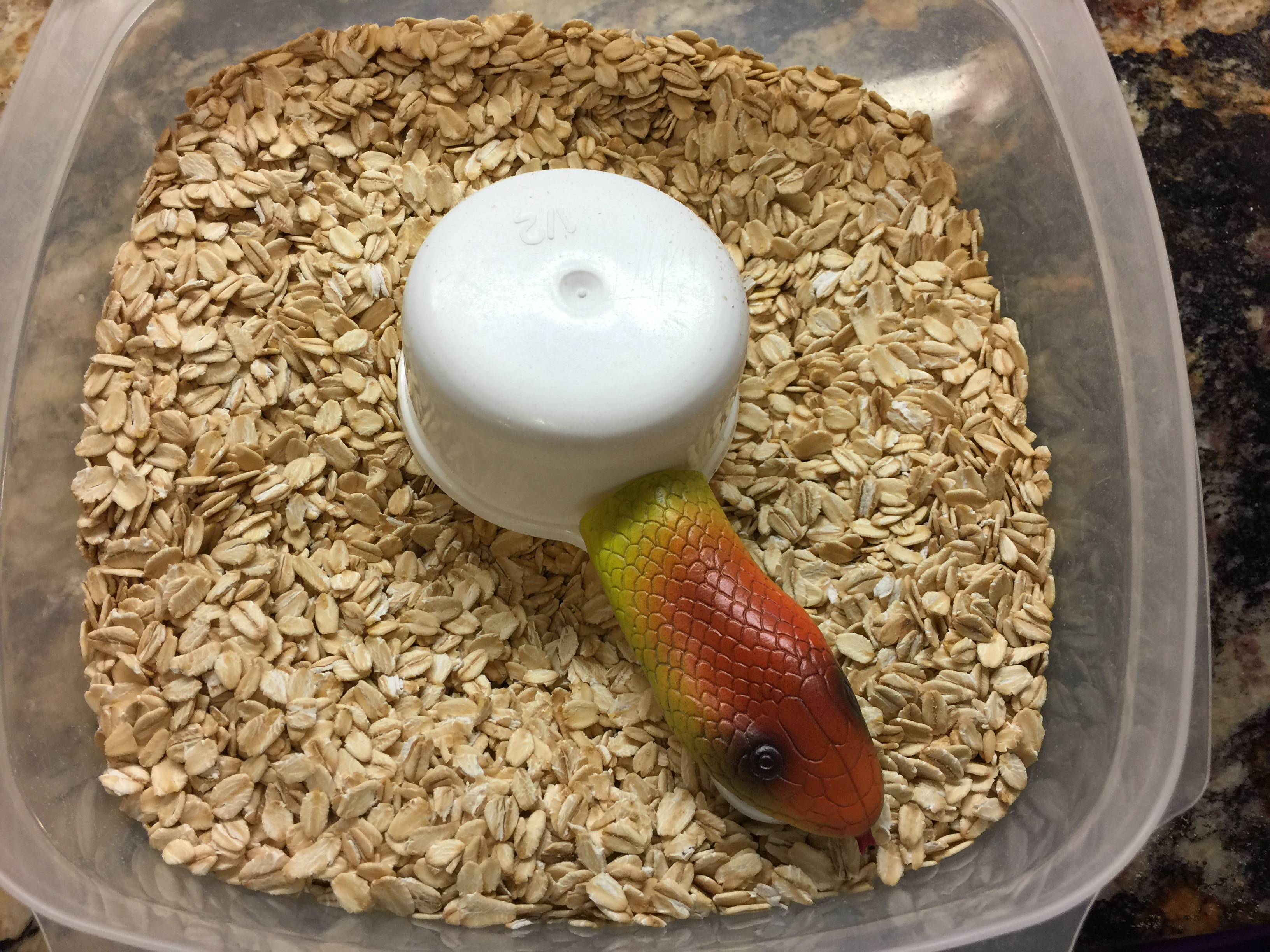 After that, the snake appeared in my container of oats where I go every day for one of my breakfast ingredients.