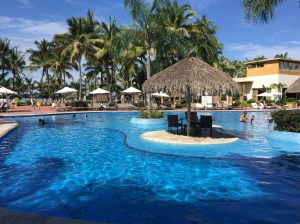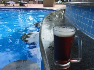 I decided to relocate to a less hazardous place, the hotel pool. There was one lounge chair on a little island in the middle of the pool and here I enjoyed reading for a while and people watching. But seeing the wait staffs continuously bring drinks around made me thirsty for a beer and so I decided to go have a seat at the pool bar, another pleasure I had never had.