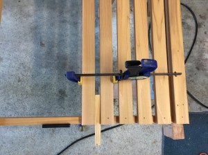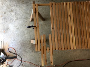The gate width was 36 inches at the bottom and 36.75 inches at the top. The 1 X 2 boards I bought were 8 feet in length. I knew I would get two gate boards from each uncut board but I still didn’t know how long each would need to be until I knew the spacing. It was essentially the chicken and egg analogy. So I decided to crack the egg. I went ahead and cut two pieces from each board 36.75 inches long and then trial spaced them out on the frame using the little scrap of wood I found.