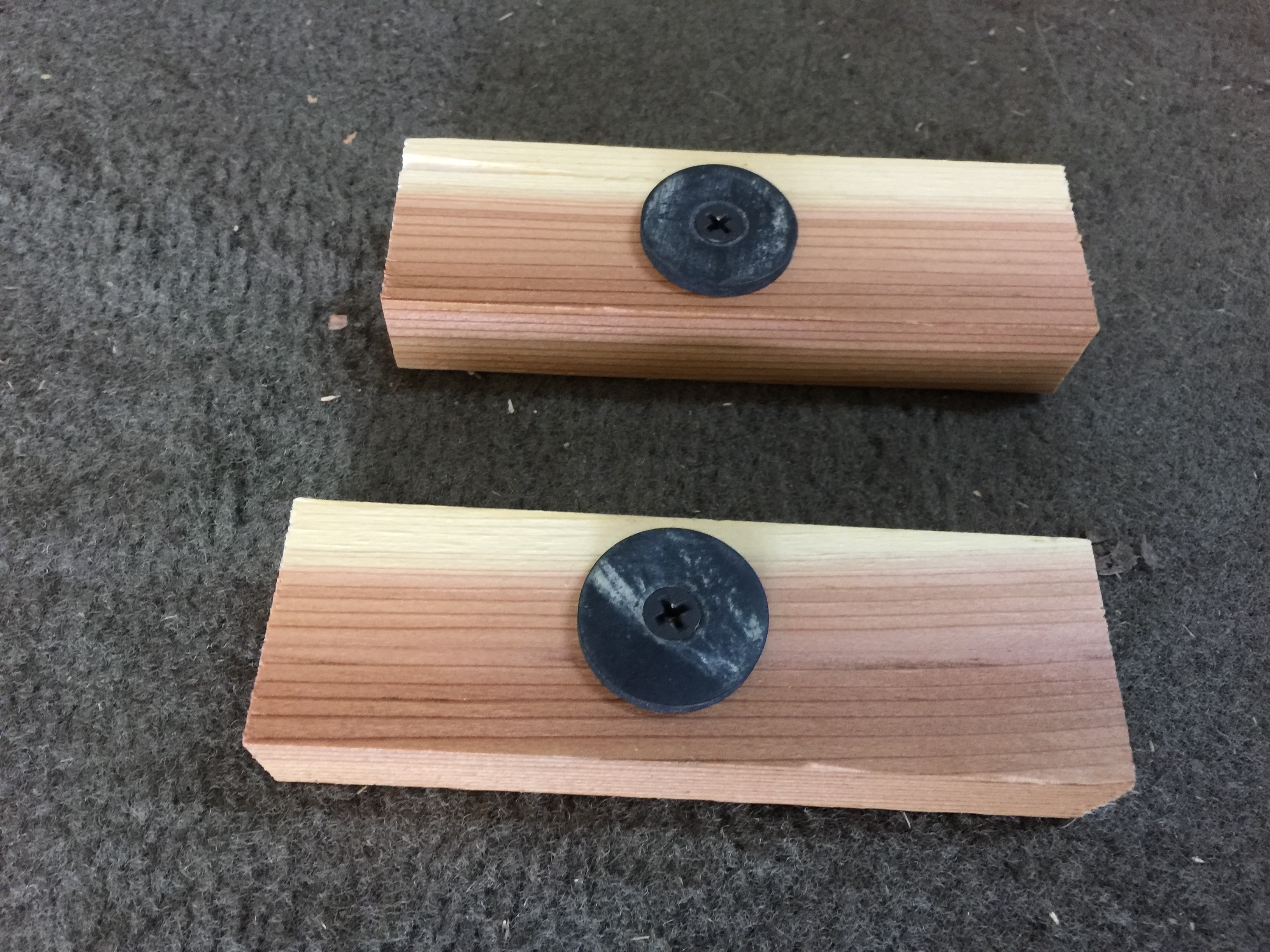 I trial fitted these boards using the narrow edge of 1 X 2 inch boards as a gap but ended up being 1.75 inches too short or about 1/8 inch too narrow for each gap. I didn’t think I could find a board in my bin that was that exact width but then came across the idea of attaching a 1/8-inch rubber washer to the 1 X 2 inch board spacer.