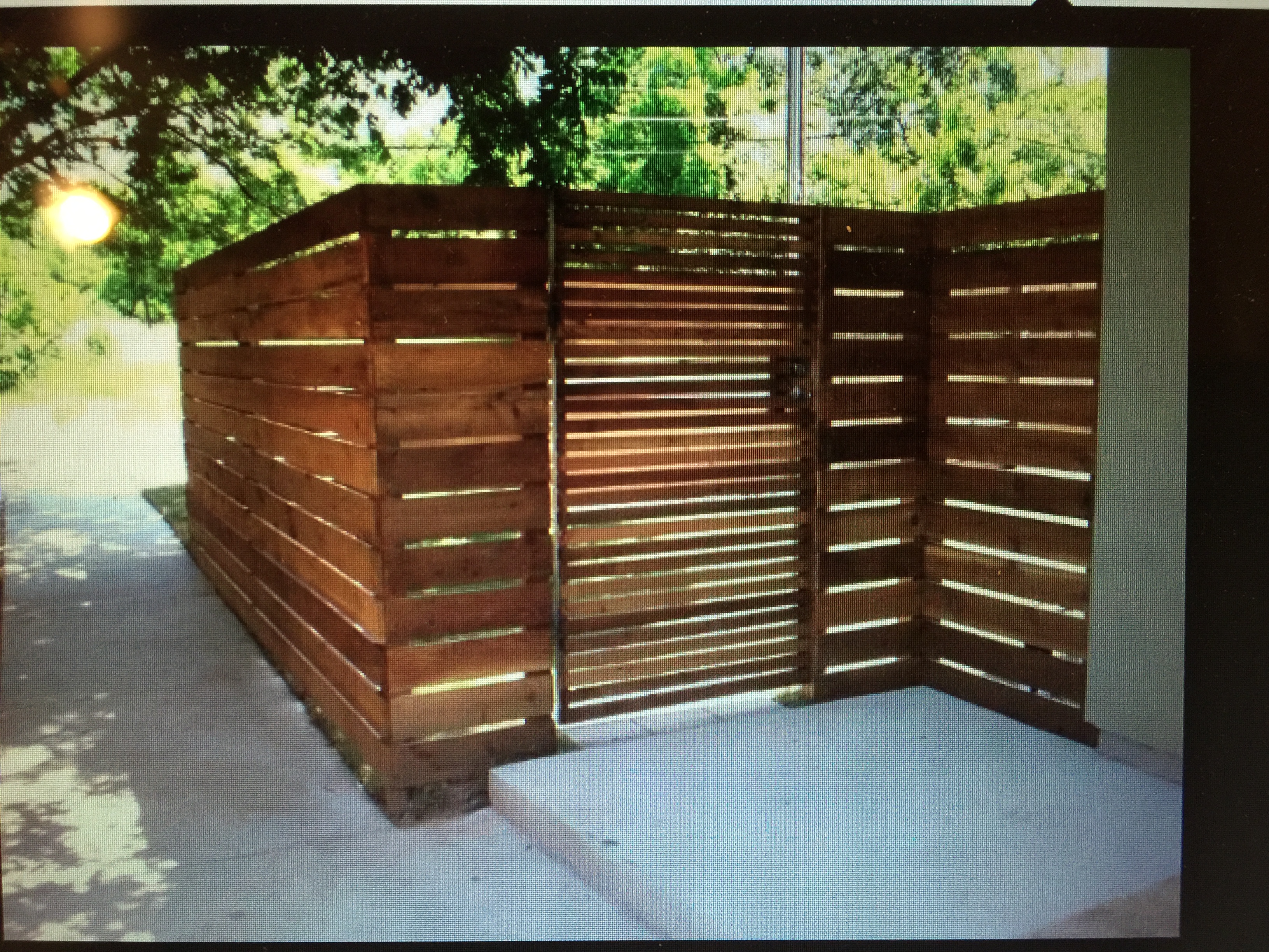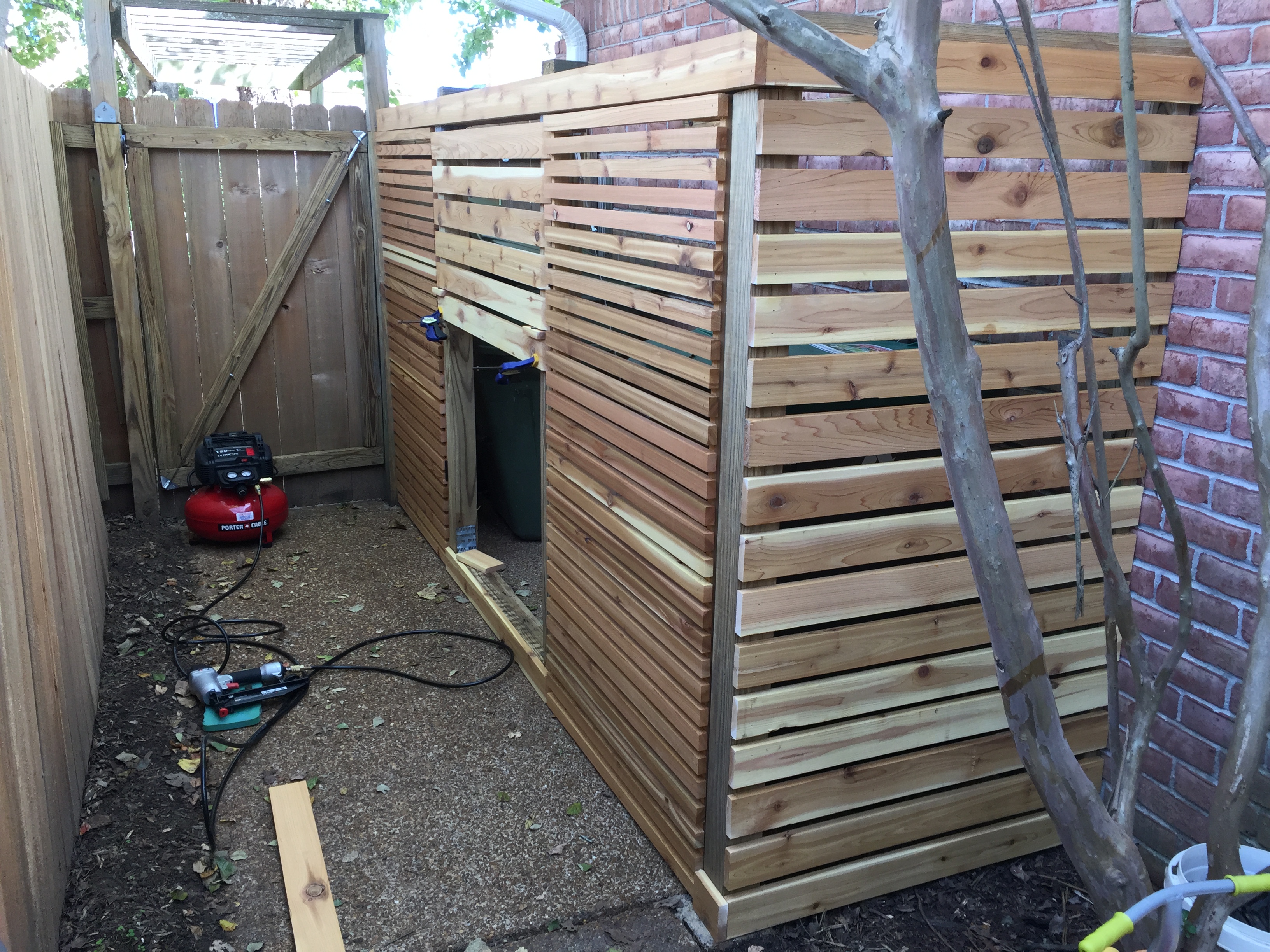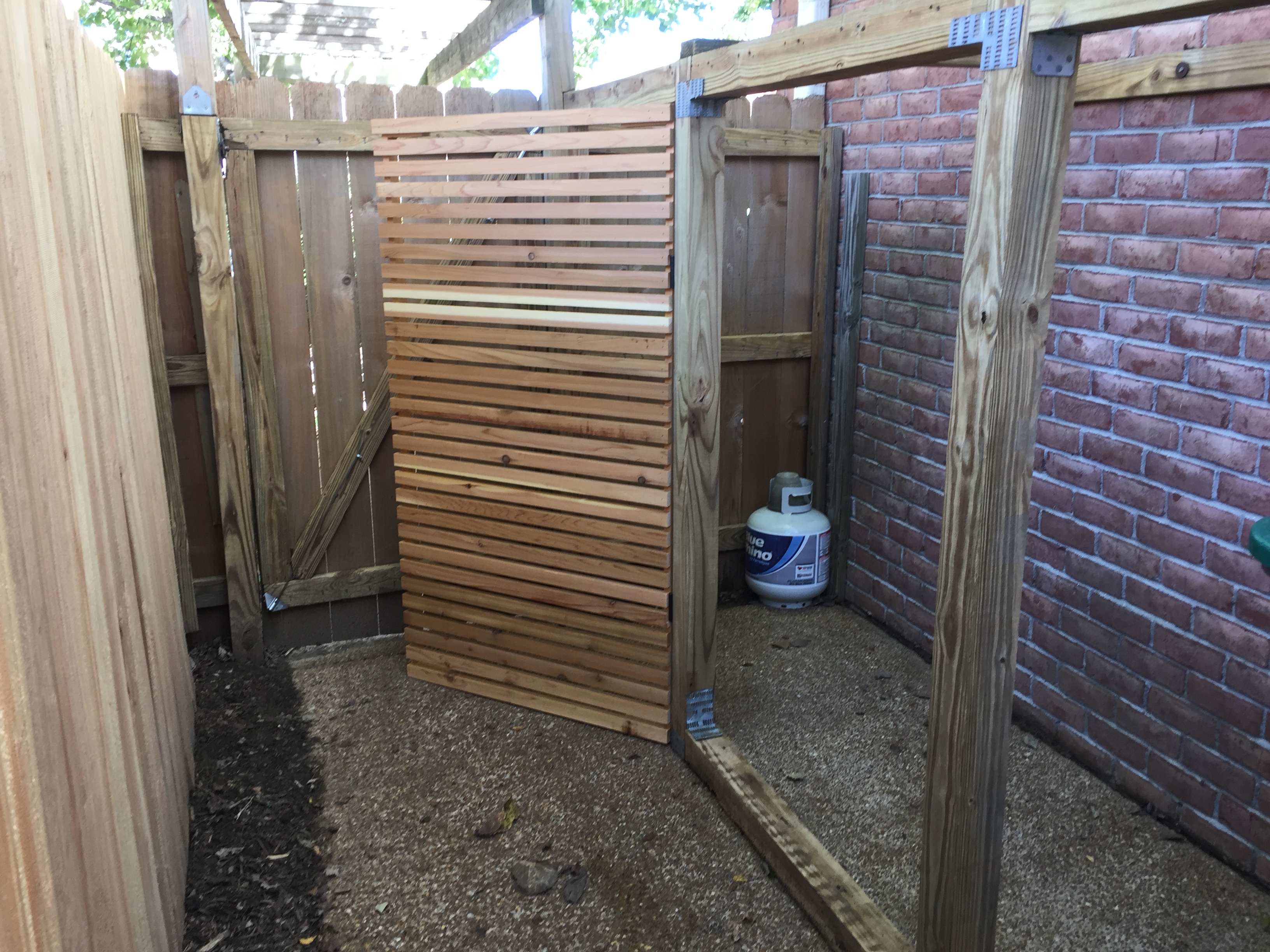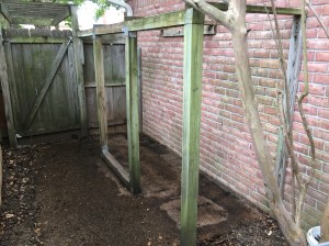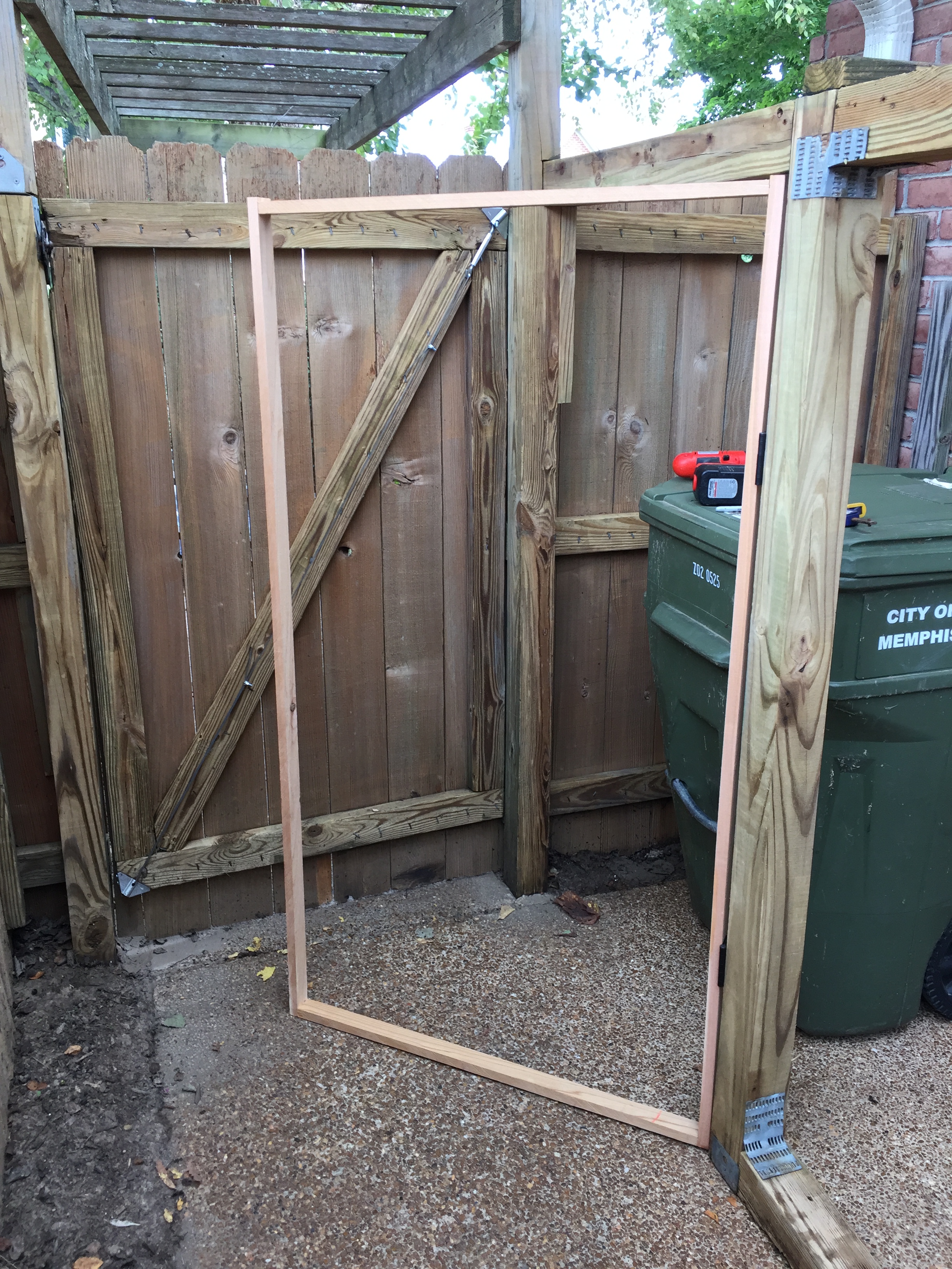 I decided to start with the most difficult part of the project, building the gates. First step was to build the frame for the gate and attach it to the garbage blind frame with hinges.