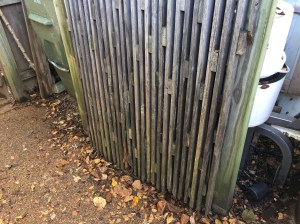 In 2015, I wrote about this garbage blind, which my oldest son designed and helped me to build before he headed off to pursue a graduate degree in architecture. At the end of that post, I noted that due to the unavailability of pressure treated 1 X 2 boards and over ten years exposure to the elements; the garbage blind was in need of “spiffing up.” Well in the three years since I wrote that post, all of the untreated 1 X 2 boards have deteriorated even further, particularly, the gates.