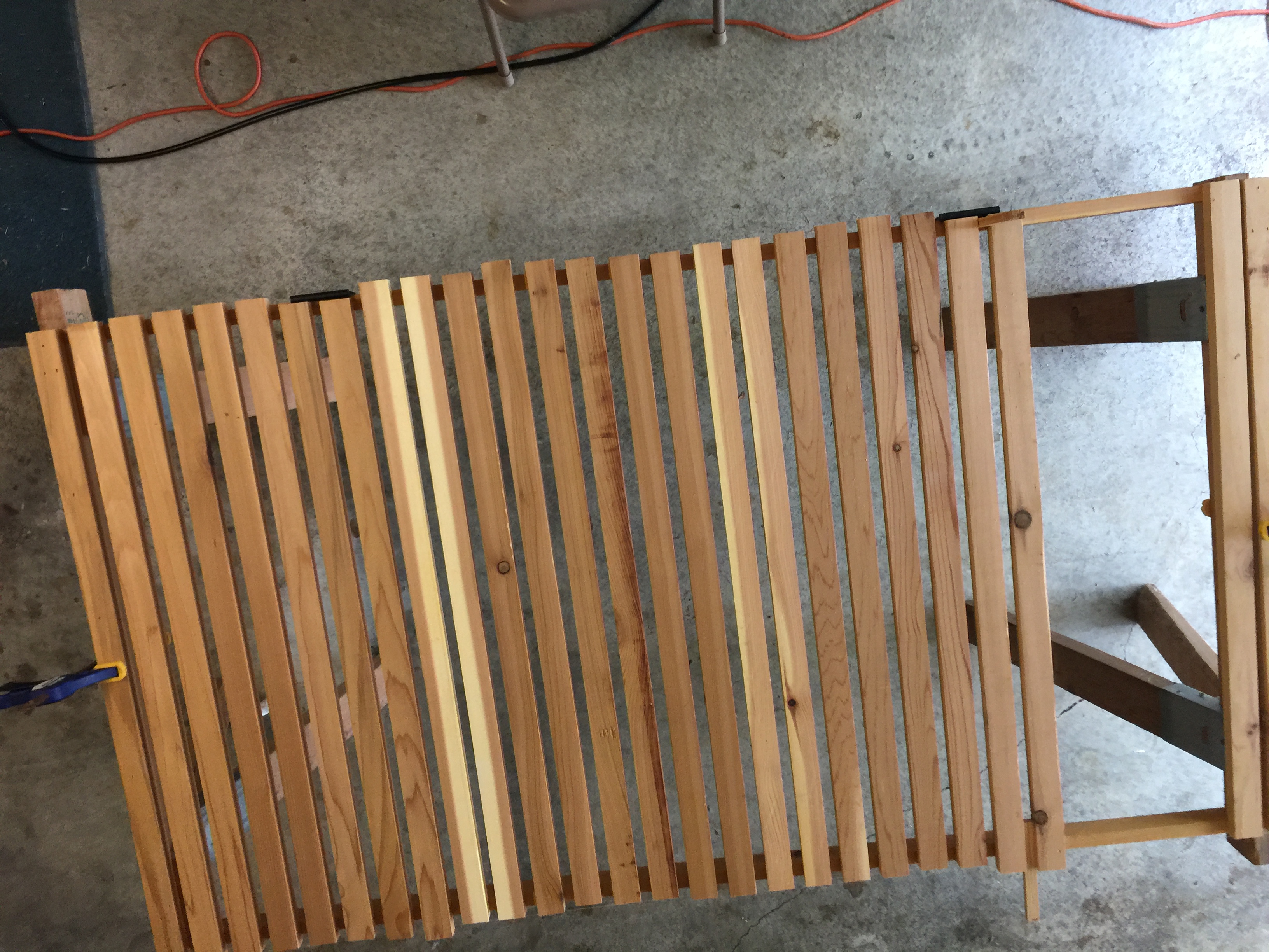 With the brain teaser overcome, the manual process began of determining the correct length of each board, cutting it to length, and then attaching it to the frame with my nail gun while the gap piece was clamped between the board to be nailed and the one previously nailed.