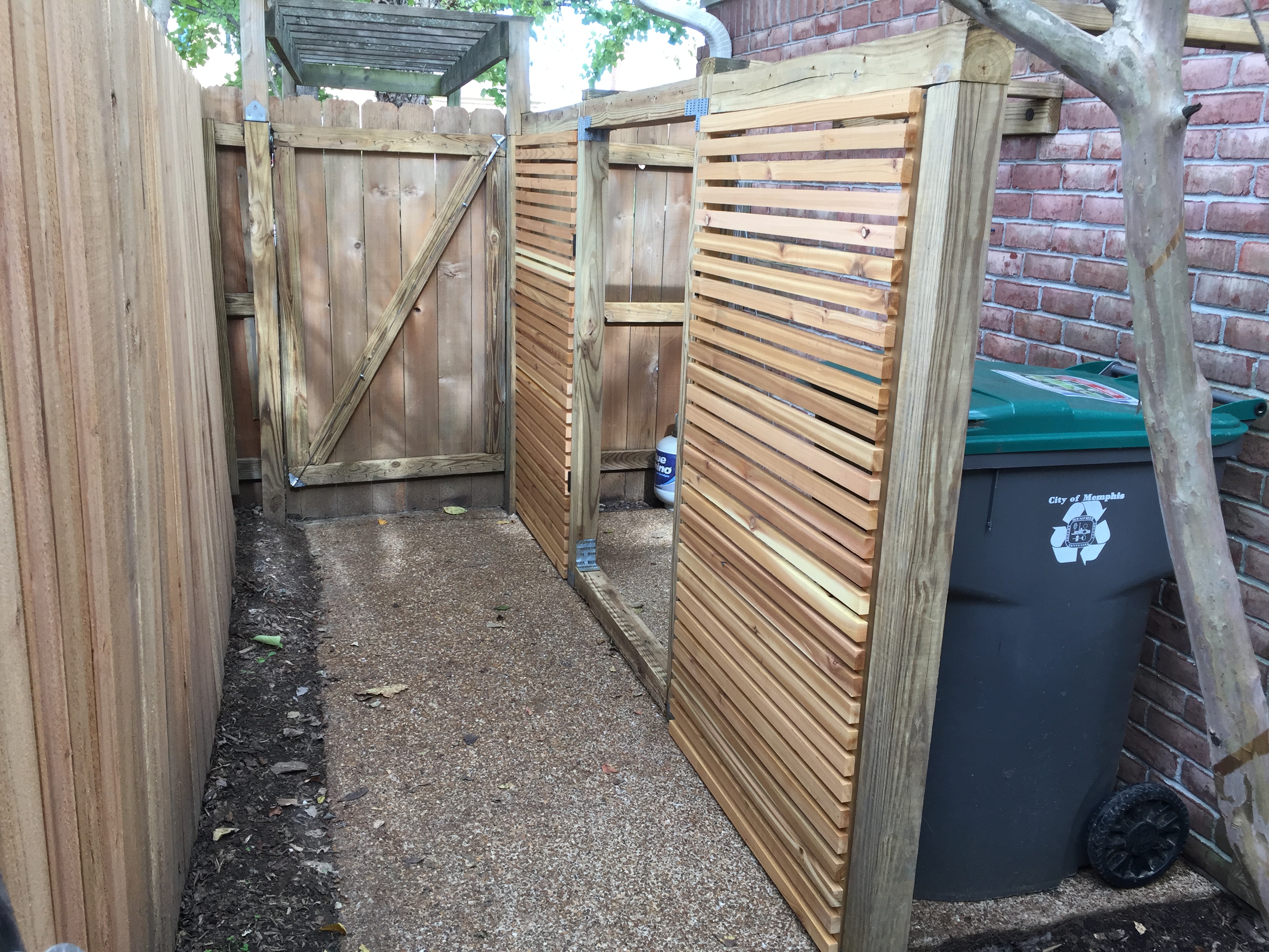 The fact that the gates had proven to be the Achilles heel of this 15-year old DIY project prompted me to explore other designs rather than just rebuilding the existing structure with new materials. Probably the easiest way to rebuild it would have been to use the same “dog-eared” cedar boards to make the blind match the fence. But that just seemed too boring.