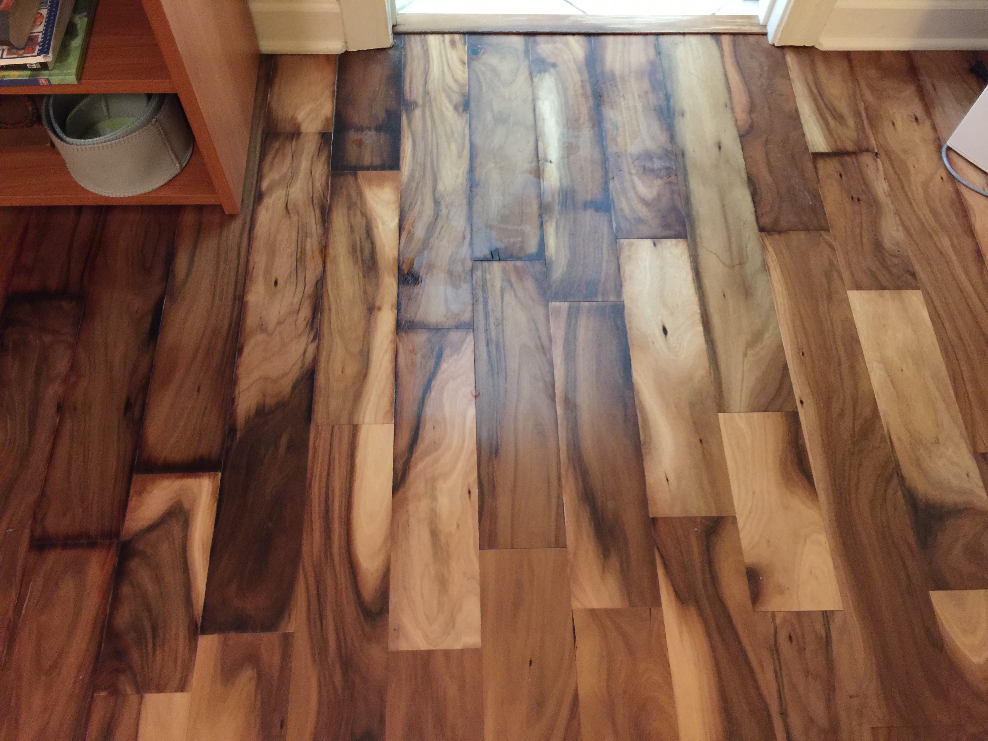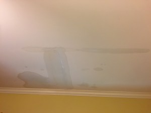 Looking down where my wife was pointing, I could see that our beautiful wood floor had sustained significant water damage and looking up, I could see that it was coming from the second floor saturating the ceiling as well.