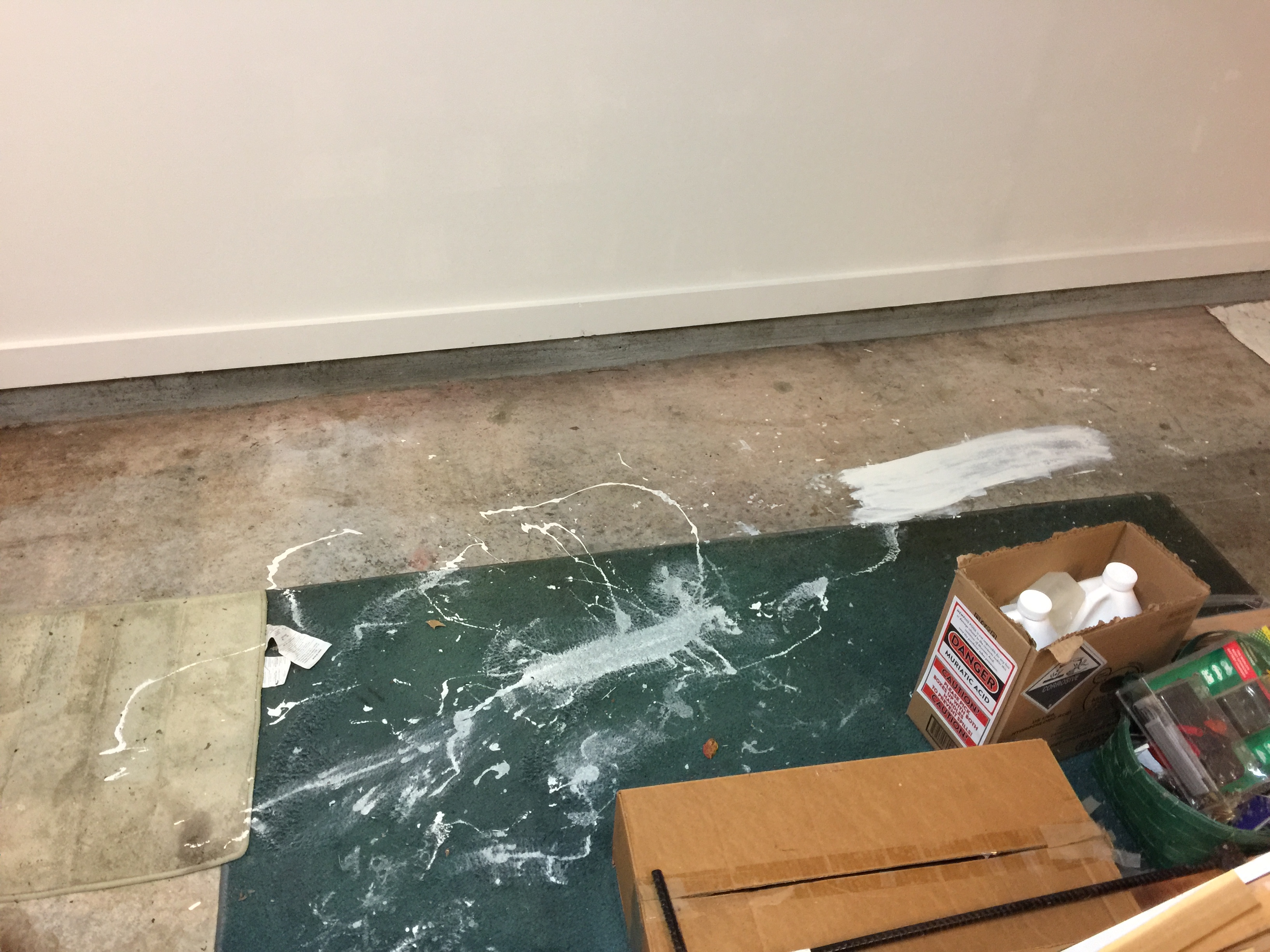 I managed to get the first wall painted with only one mishap, a large paint spill that not only got on the rug and garage floor, but also on my jeans and shoes. Now I could proudly wear the badge of a battled-hardened painter.