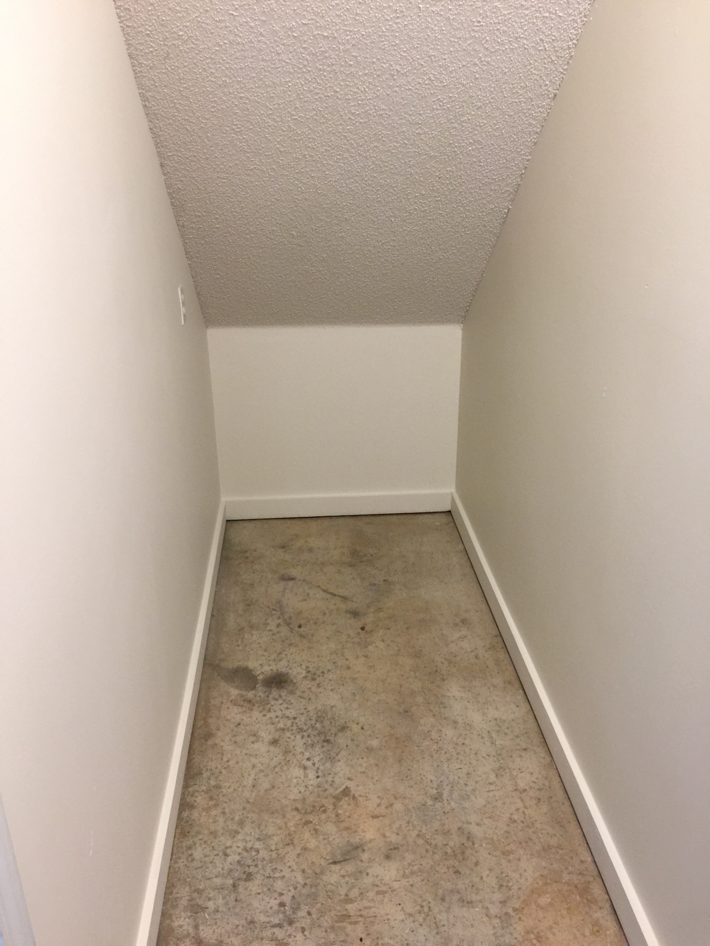 The opposite wall went just as quickly (with no spills) since I had the routine down: vacuum all the spider webs from the walls and ceiling, brush paint along the baseboard and ceiling, and then roll paint. Because I was painting an almost exact color match with no doubt, much higher quality paint than original, I was able to cover the walls with just a single coat, probably for the first time ever in spite of always using paint advertised as only requiring a single coat.