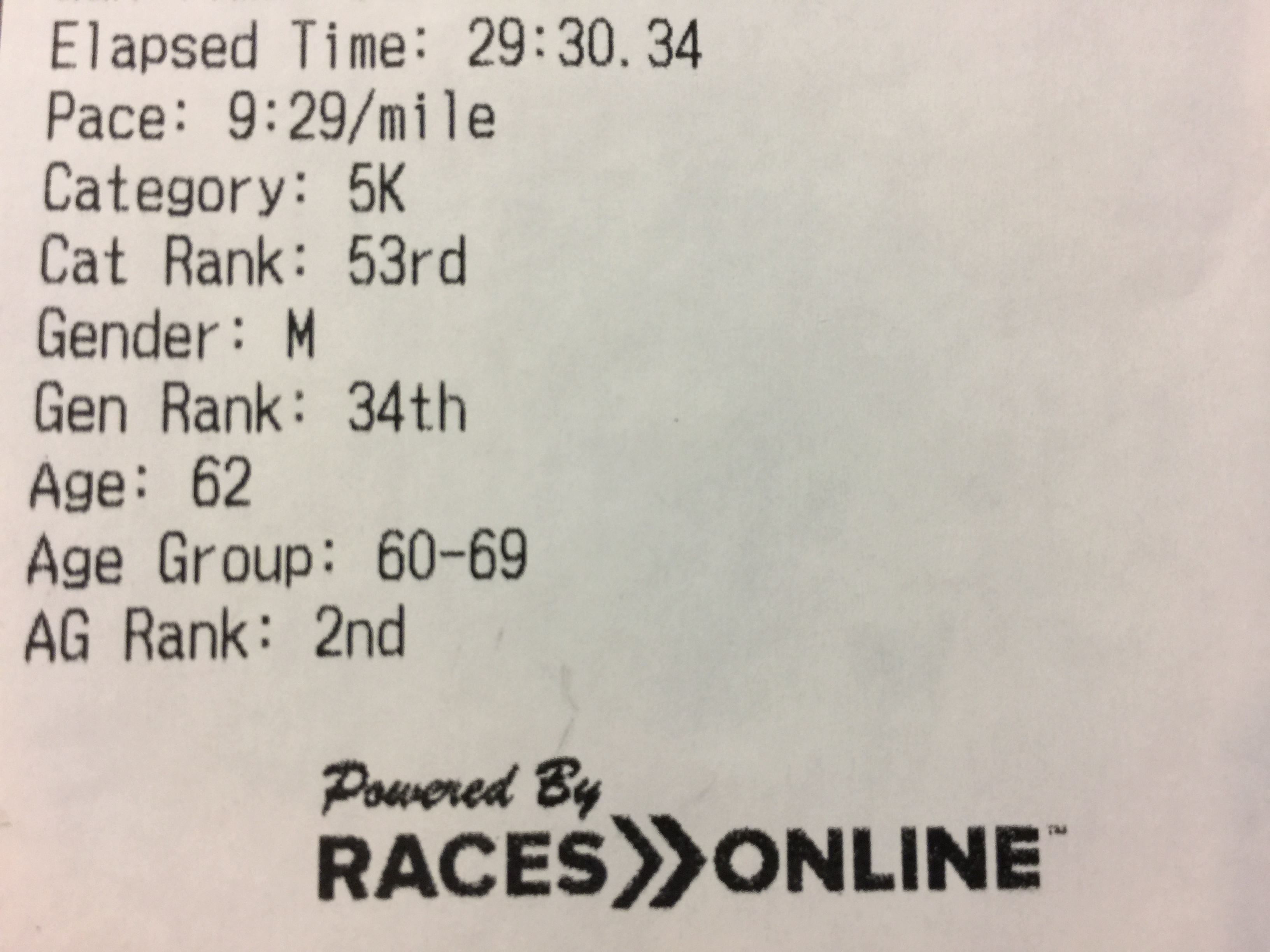 When I got home, I found I had received a race e-mail message with a link to the final results. When I clicked on it, I saw that I had actually missed finishing first by less than 16 seconds! Probably that last person that I had almost passed finished just ahead of me. Now I had even more motivation to keep racing. Which I plan to do!