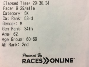 In the heat of competition, I know I started off at a faster than usual pace and as I eagerly searched for the 1-mile marker, I could sense I was slowing down. But with my shirt as a reminder, I did think of that run so long ago with my daughter, a very joyful thought. It spurred me on and when I passed the half way mark and found my split time of 14:45, I was most pleased.