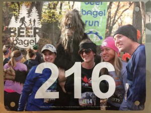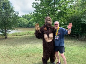 I managed running the entire course without stopping once (or slipping and falling) and was pleased to see a time of 39:13 click off as I passed the finish line. I learned later from my friend who tracked the route with his GPS, that the course was actually 3.8 miles. While it was a bit disappointing to learn that I had not beaten a 10-minute pace, this still gave me a respectable pace of about 10:30 per mile, not bad given it was 50% longer than my usual run. And what better way to capture the moment than with a photo of Sasquatch himself who had growled us on.