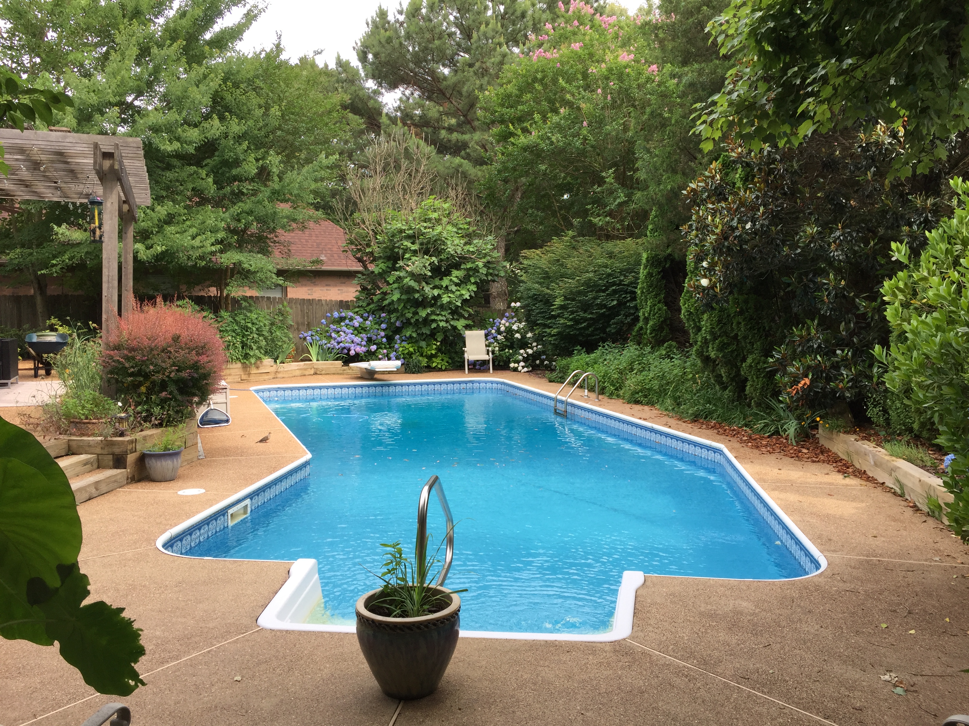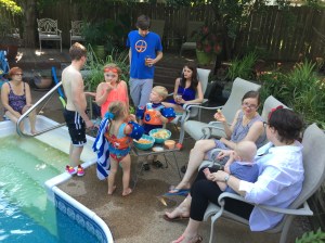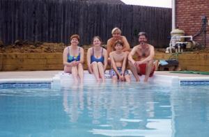 Over the years, our home welcomed a number of our out-of-town family members, our friends, and our kid’s friends. With the pool as an attraction, we often had Fourth of July parties in our backyard. The landscaping around our pool matured nicely starting with this…