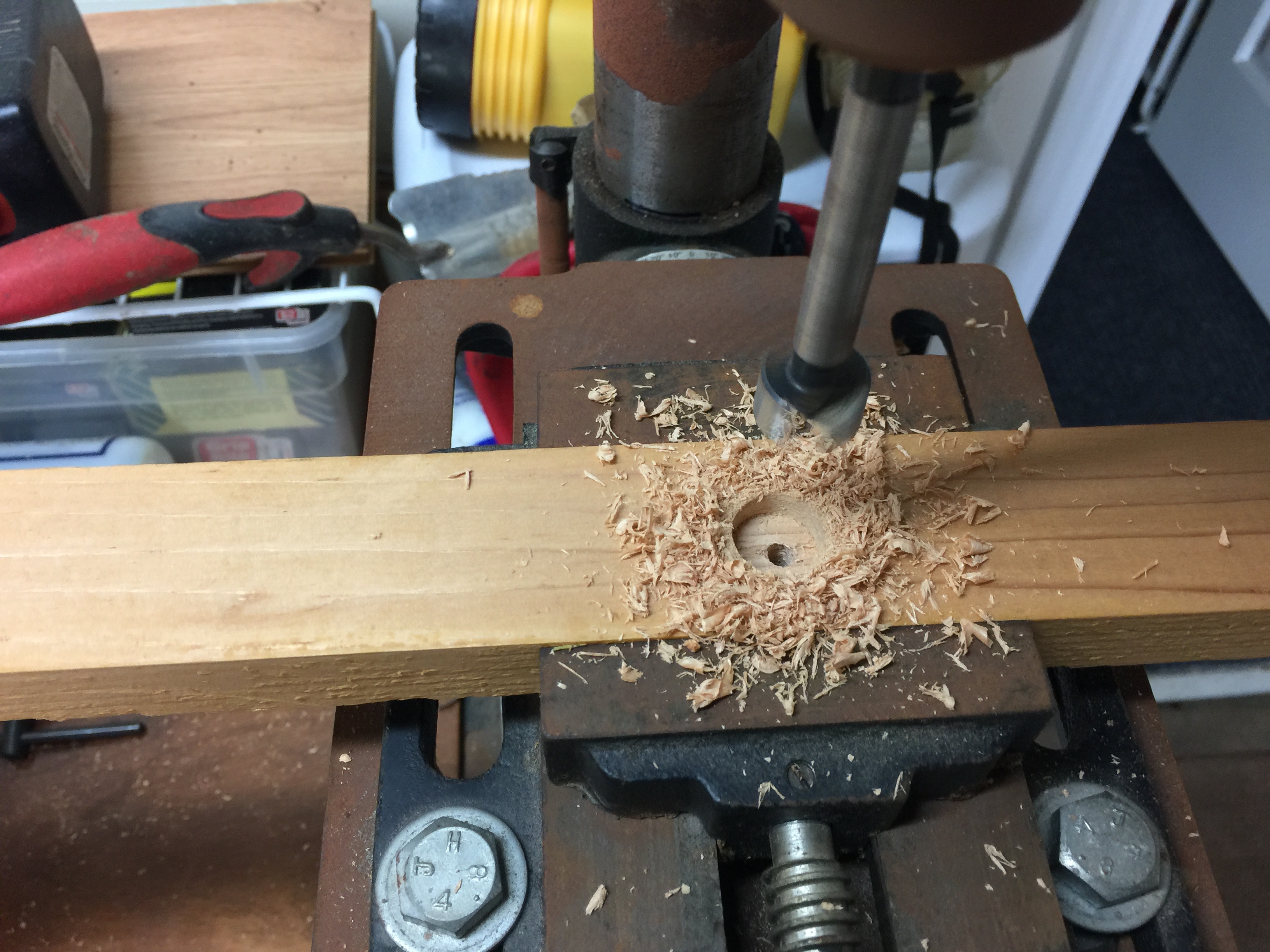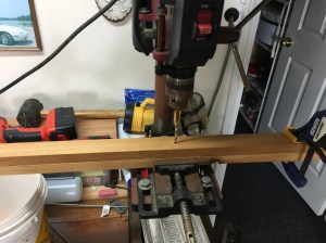 Unfortunately, my chosen drilling technique became like one of those childhood telephone games where one child tells a story to the next child and so on until by the time the story gets to the last child, it is quite different from what it started out. Turns out a slight difference in widths of some of these boards (they were obviously not precision machined) caused the hole to begin to get lower and lower off center.