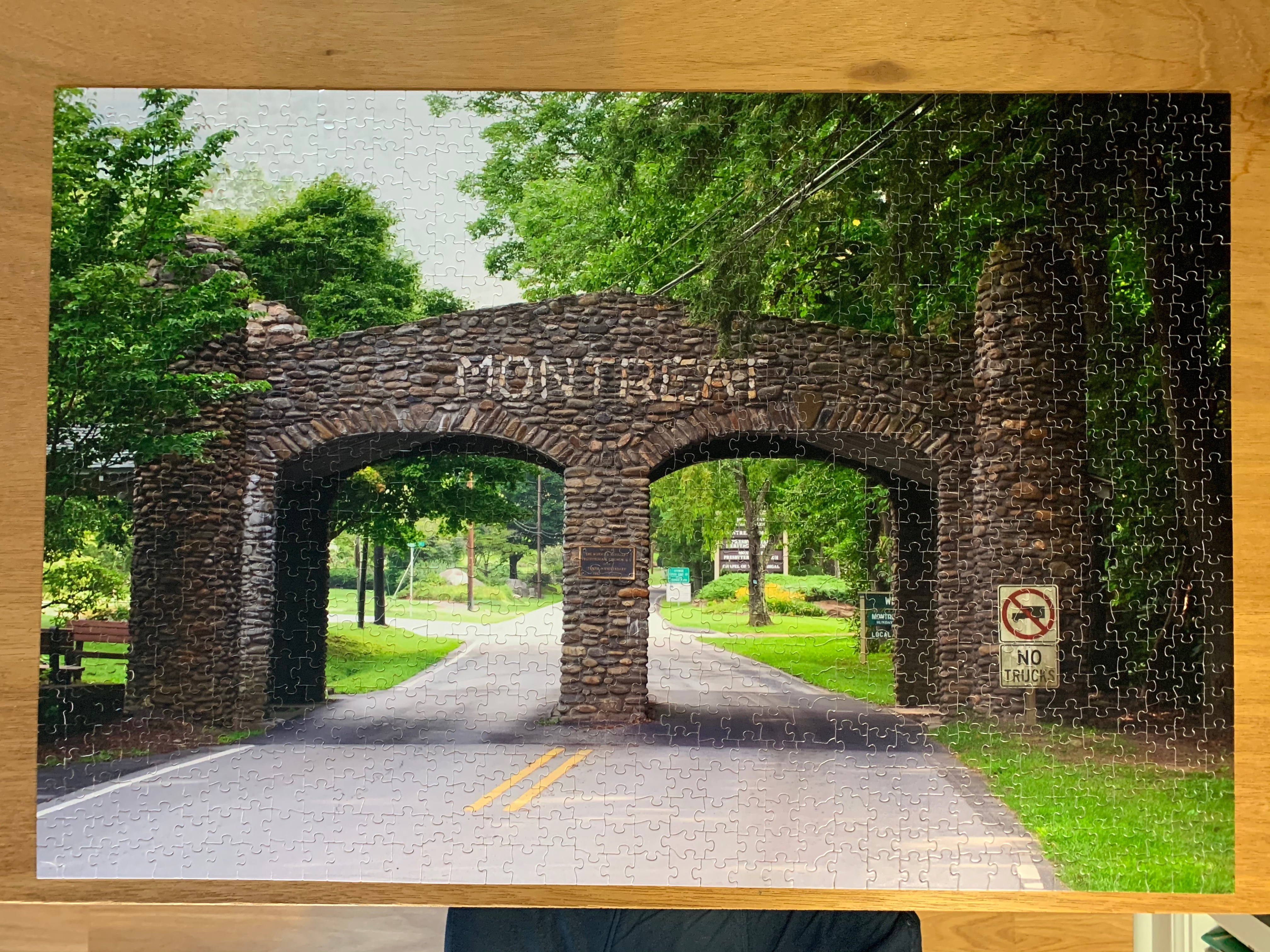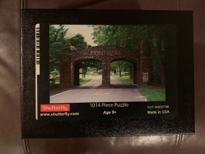 Last year in May when I was in Montreat with my sister, I found that the giftshop overlooking the waterfall had a puzzle of the rock gate, that iconic welcoming feature for anyone who is a regular visitor to this peaceful retreat nestled among the mountains of western North Carolina. I had been hoping they would have one for some years now but when I picked it up, I saw that it was only a 550-piece puzzle. Since I much prefer the challenge of a 1,000-piece puzzle, I placed the box back on the shelf.