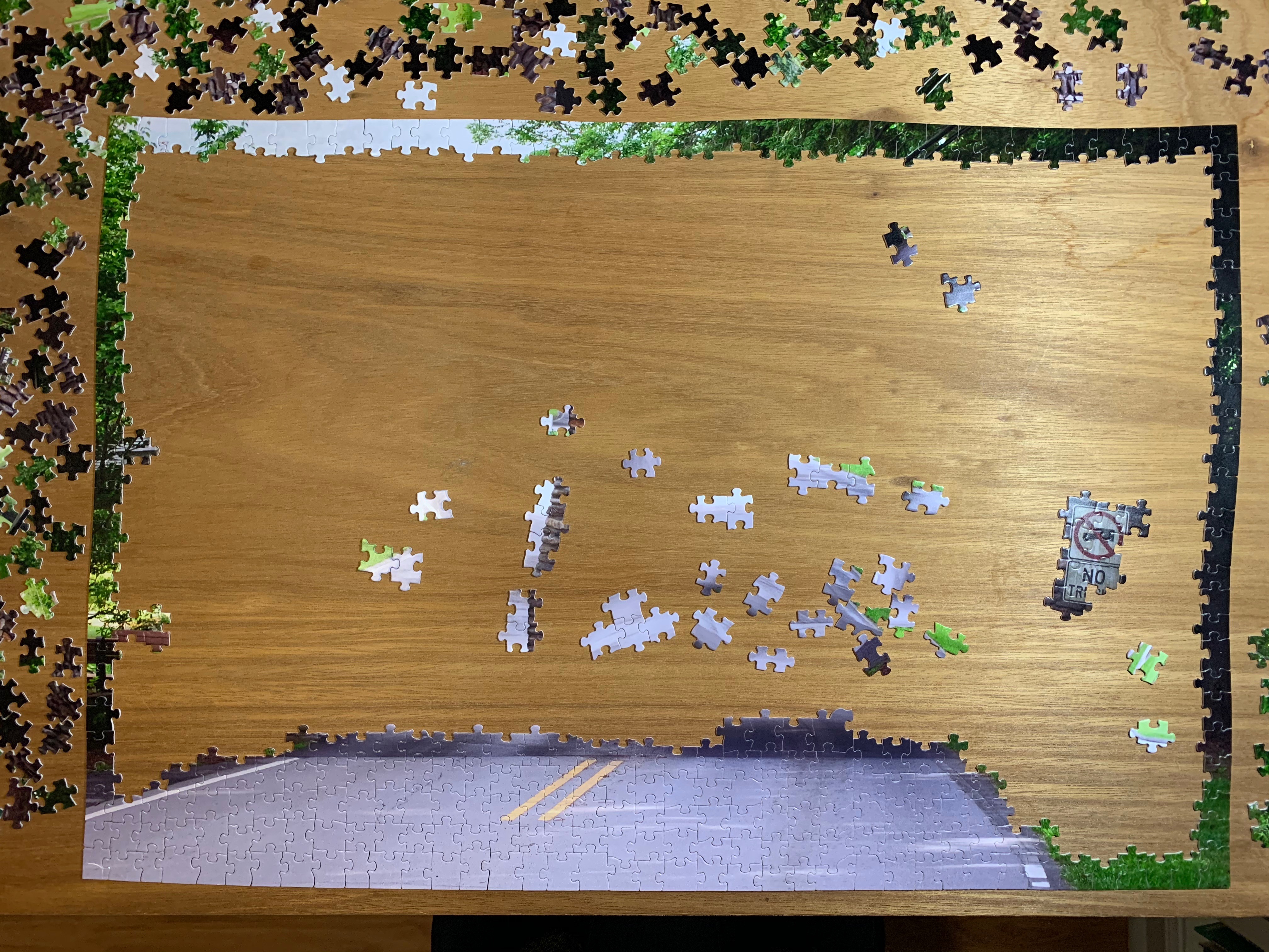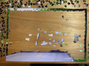 I decided to start at the bottom with the road as these pieces were easily identified among the many other pieces. This gave me my first taste for what would prove to be a very difficult puzzle (sorry Bro). With the color uniformity of most of the pieces, it became a one-for-one trial and error approach. But it gave me a good relief from commercial breaks while watching college bowl games.