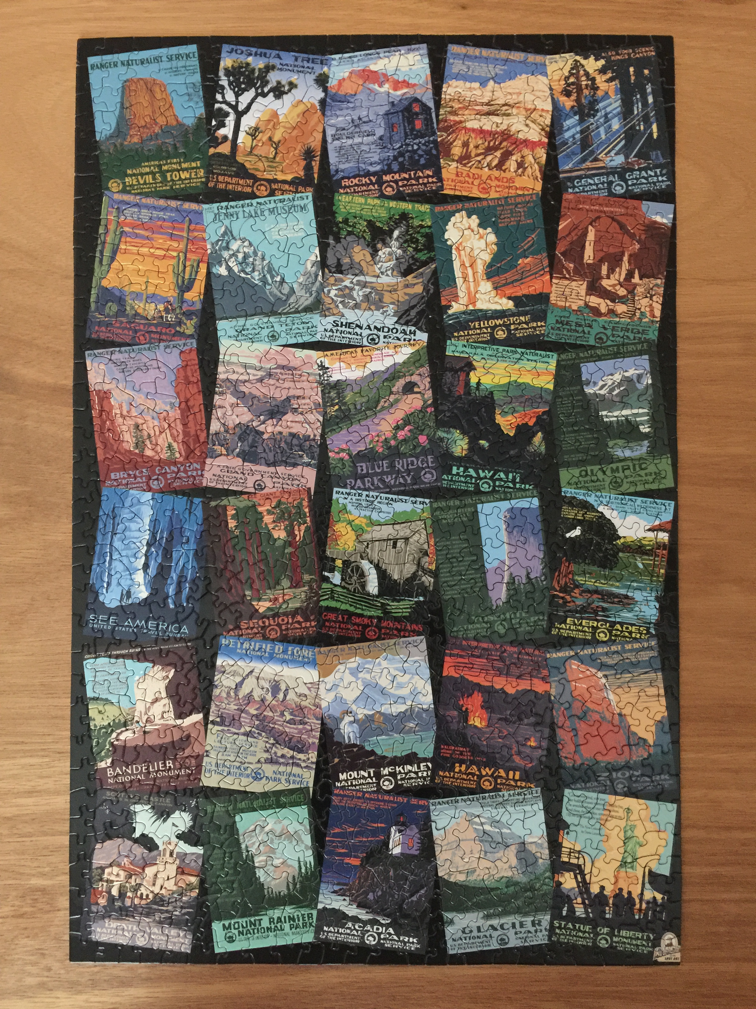 As I looked at the details of the photo on the box to see where I would focus my attention next, I realized that the puzzle was made up of retro advertisement photos overlaid on each other, one of which was even a salute to our hometown, Memphis. It was akin to the National Parks puzzle I put together last year that depicted 30 vintage National Parks posters. I had a blast assembling that puzzle so I knew I would have fun doing this one as well.