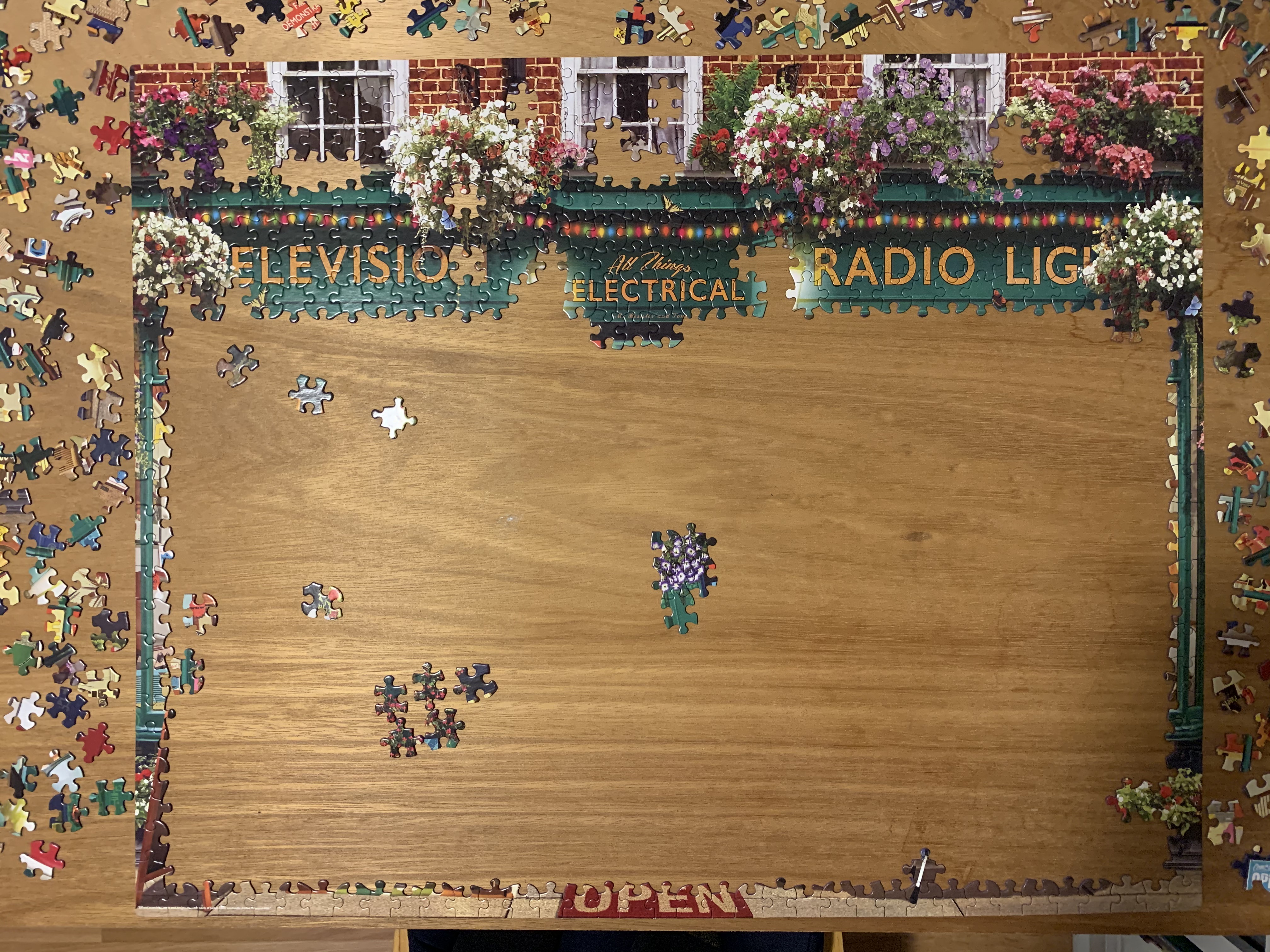 Once I had all the pieces laid out and had built the frame, I decided to take a different approach from my typical and start at the top of the puzzle. Here were easily recognizable brick and window pieces and flowerpots. With just a few missing pieces still hiding somewhere on my work surface, this proved to be a wise starting point.