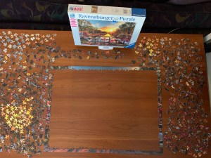 The next day, my wife and granddaughter also joined in the fun and helped out, although while the pieces placed by my granddaughter fit, they didn’t necessarily match. But she still took pleasure in snapping them in. My wife continued to help me and when we were down to less than 100 pieces, the finalization went fairly quickly with my wife completing the windows on the left side of the puzzle as I worked on the right side.