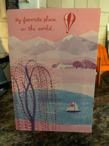 I am not what you would call a “hoarder” but when it comes to greeting cards, I just can’t seem to put them in the trash. Which I am glad I don’t as when I pulled out this box and started looking through the saved cards, some going back almost 20 years ago, I had a chance to relive the moment of their receipt along with a smile for the sender. While I do save every one of these cards, I admit I do have my favorites that I can still recall.