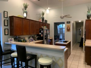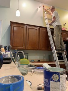 When I started in the kitchen, I found that with the kitchen cabinets in place, the 8-foot ladder did not allow me to get close enough to the ceiling to paint. My 10-foot ladder is actually a 20-foot extension ladder and when I climbed up to see how far up the ladder I would have to go to reach the wall next to the ceiling, I felt the ladder could slip on the tile floor and plunge me to the ground.