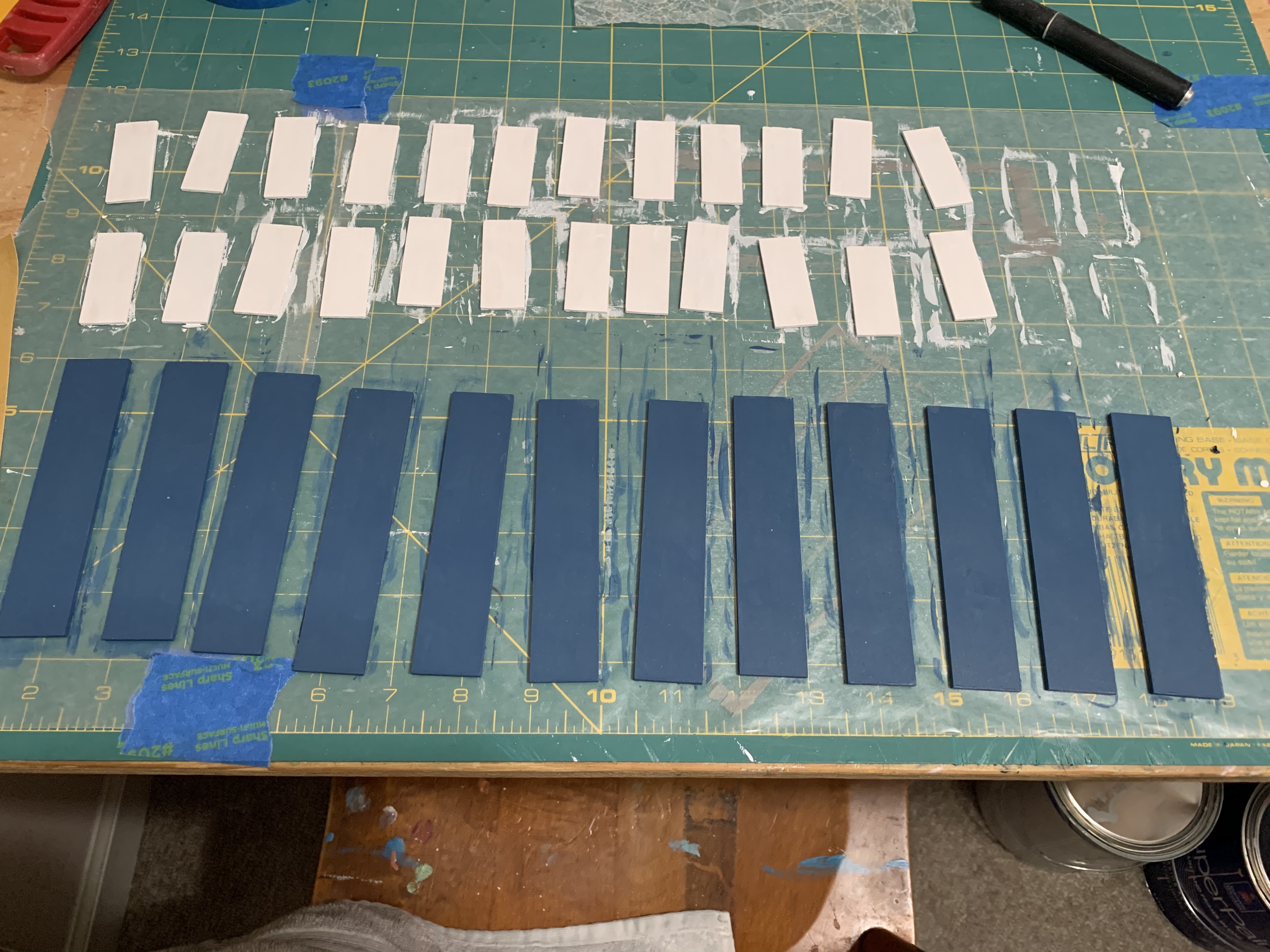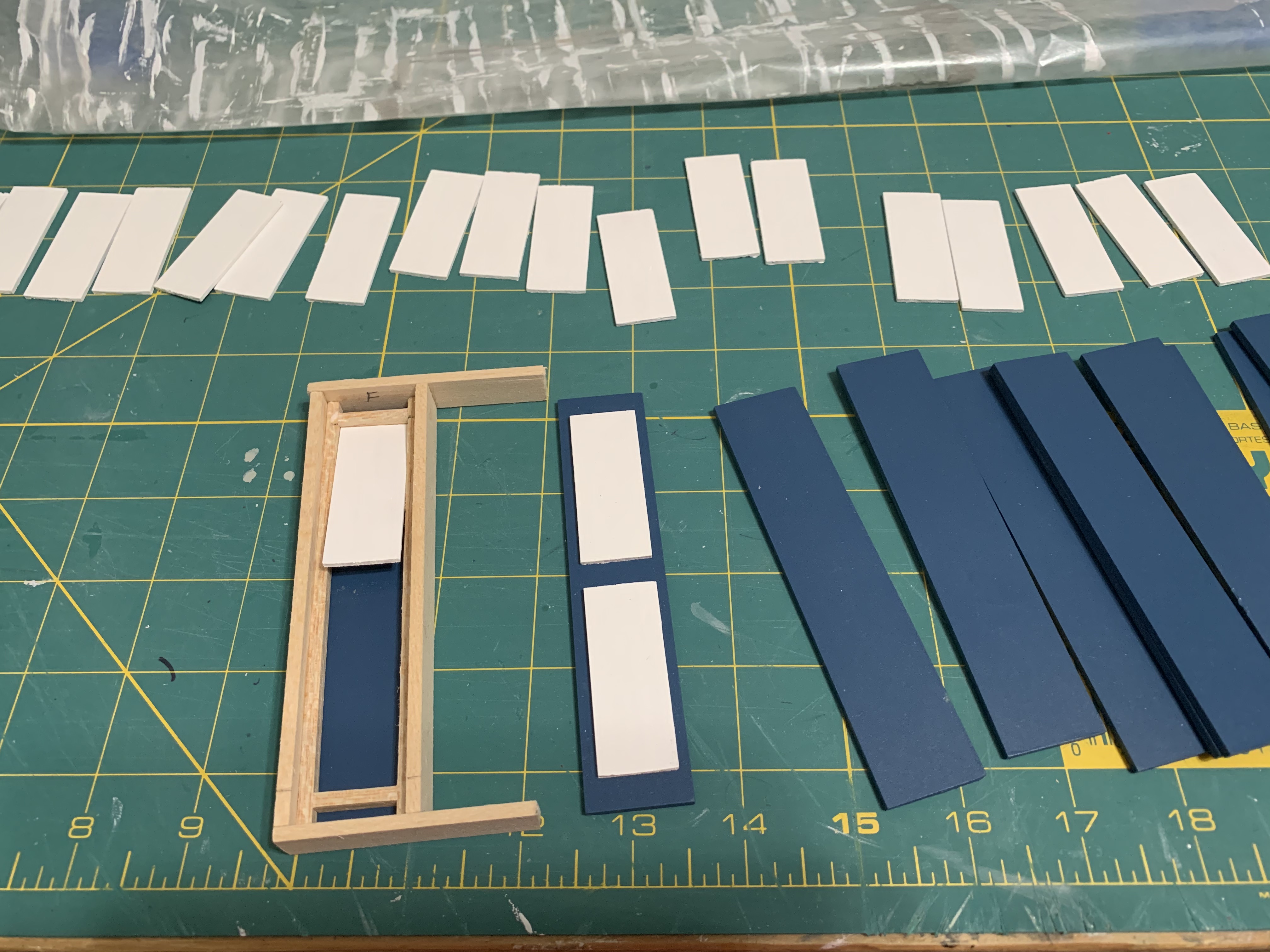 According to the diagram in the instructions, the two shutter panels were supposed to be evenly spaced on the shutter core, top to bottom and left to right. The problem was how to easily get them centered just right 24 times when the required measurements needed were not an even 1/16 of an inch or millimeter distance. Plus, the instructions indicated that since the panels were so thin, too much glue would cause the edges of them to curl.