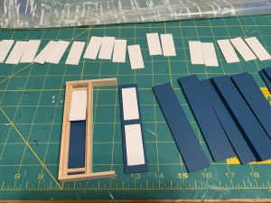 I pondered this for a few days while trying to get even one shutter just right without any success. Then I decided to do what I did before and build a jig to make the assembly easier. Again, using some extra small pieces of wood that I found leftover from my son’s college architecture modeling days, I designed and built a jig that the shutter core would fit into with guides along the bottoms and sides for placing the panels evenly. Also, to avoid the curling issue (which I did in fact experience with water-based glue), I used a single drop of a solvent based super glue to secure the panels. Since this glue dried in 15 seconds, I was able to crank out the finished shutters quickly.