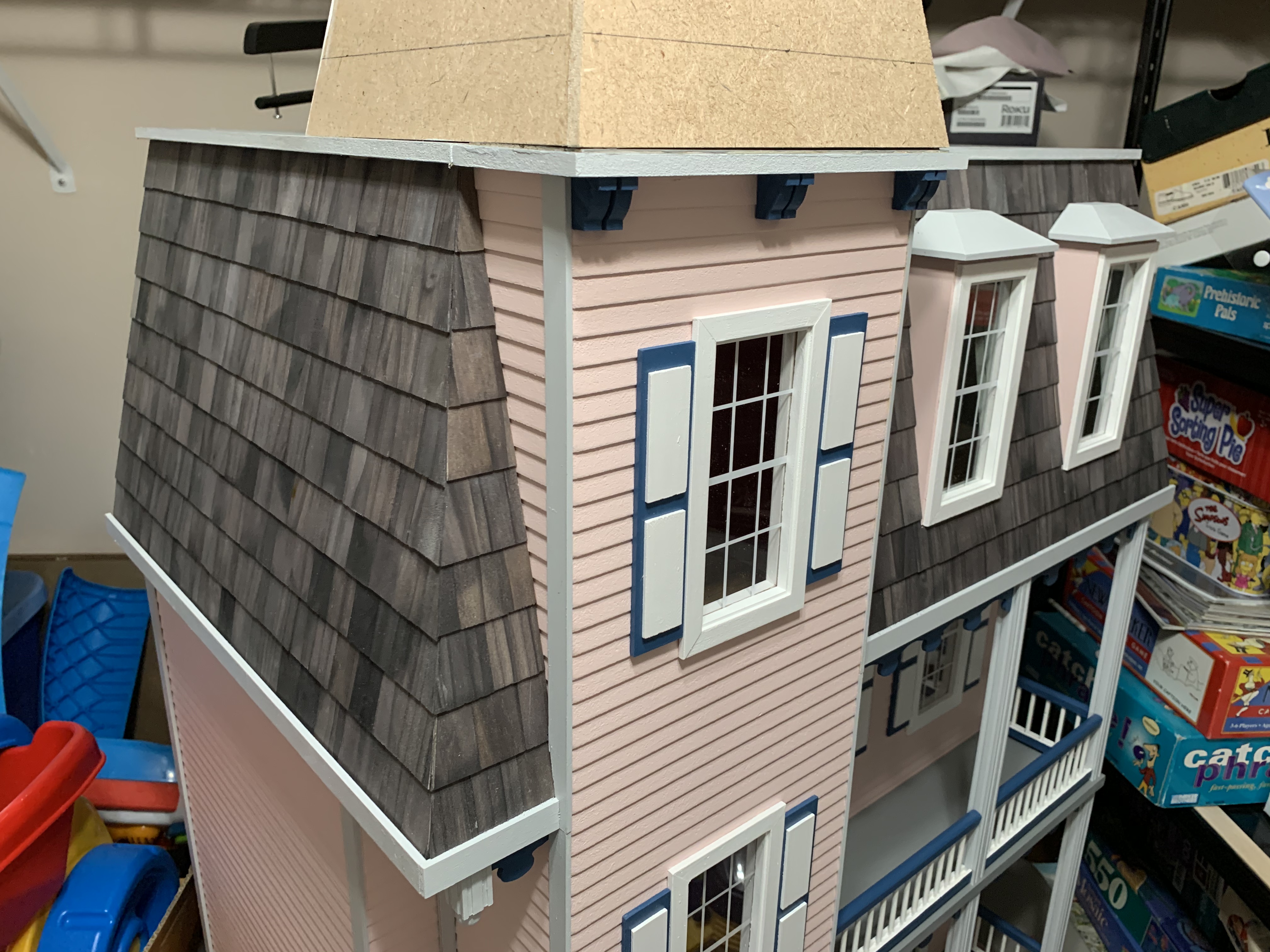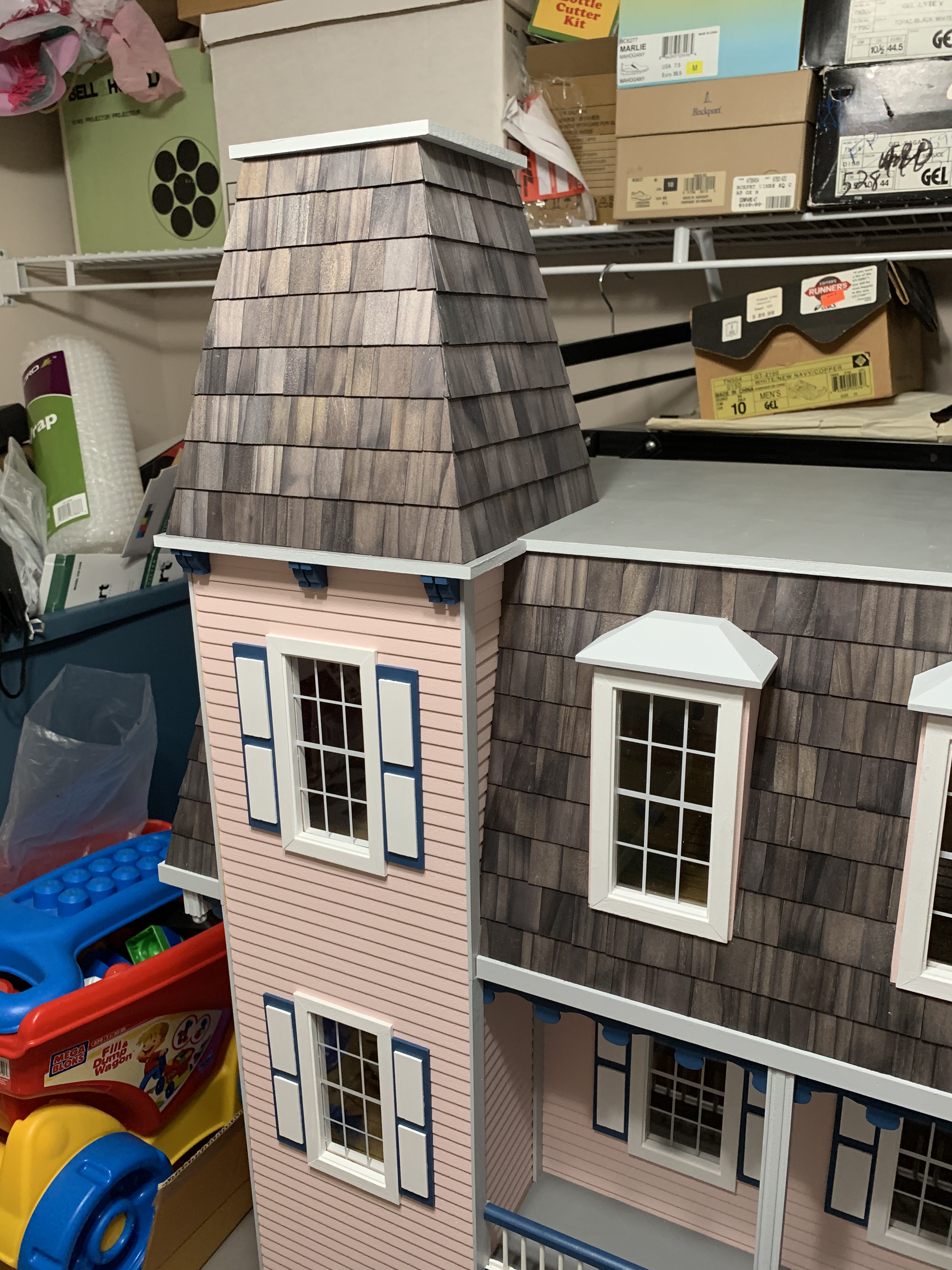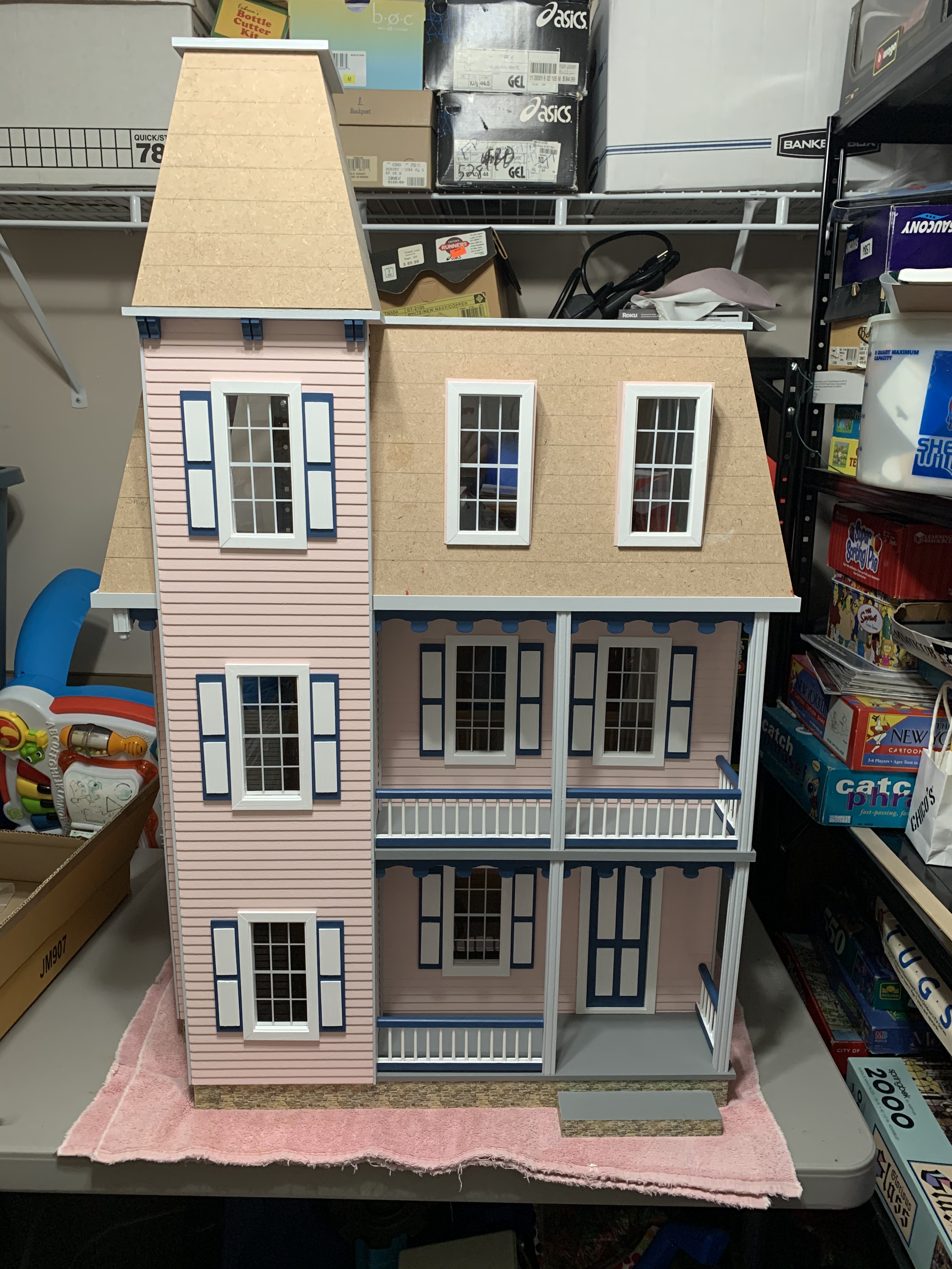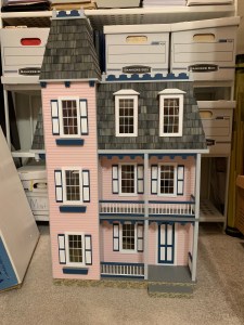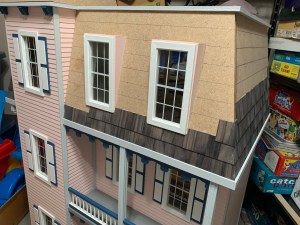 I completed the house by the end of May and so then needed to keep it hidden until Christmas. I knew it could not stay in its present cloistered location as my wife had already prevented our granddaughter from entering the playroom closet looking for games that were also stored in that closet. So, into a less used closet it went for safer keeping until Christmas morning when my granddaughter would excitedly discover it under the tree.