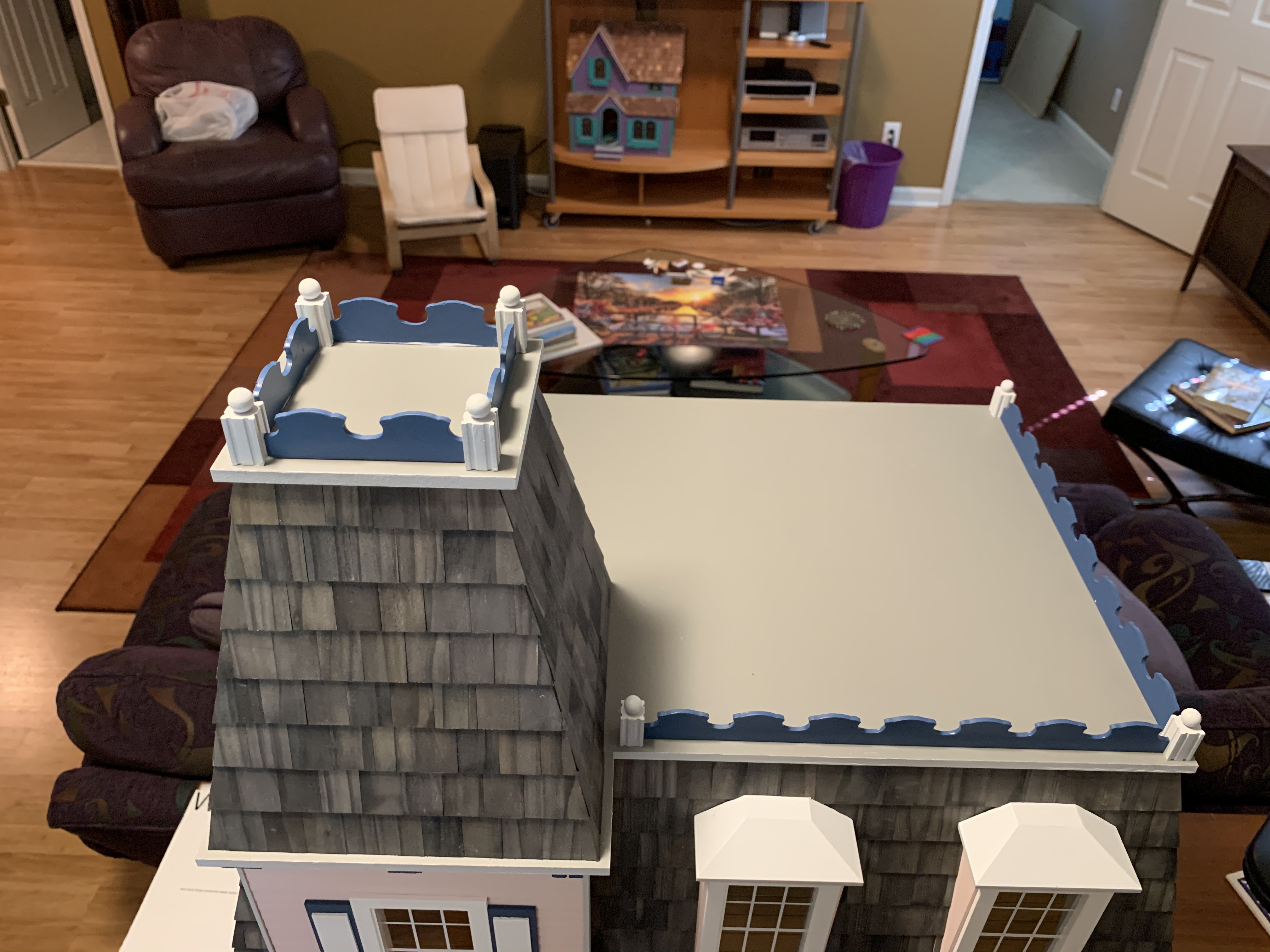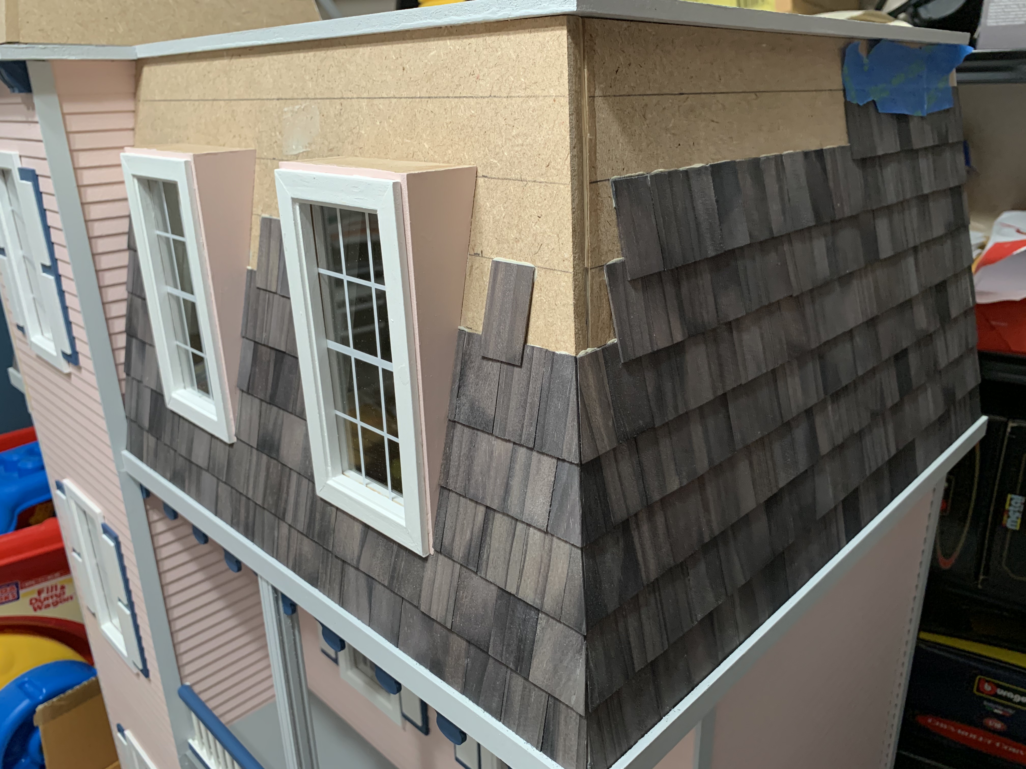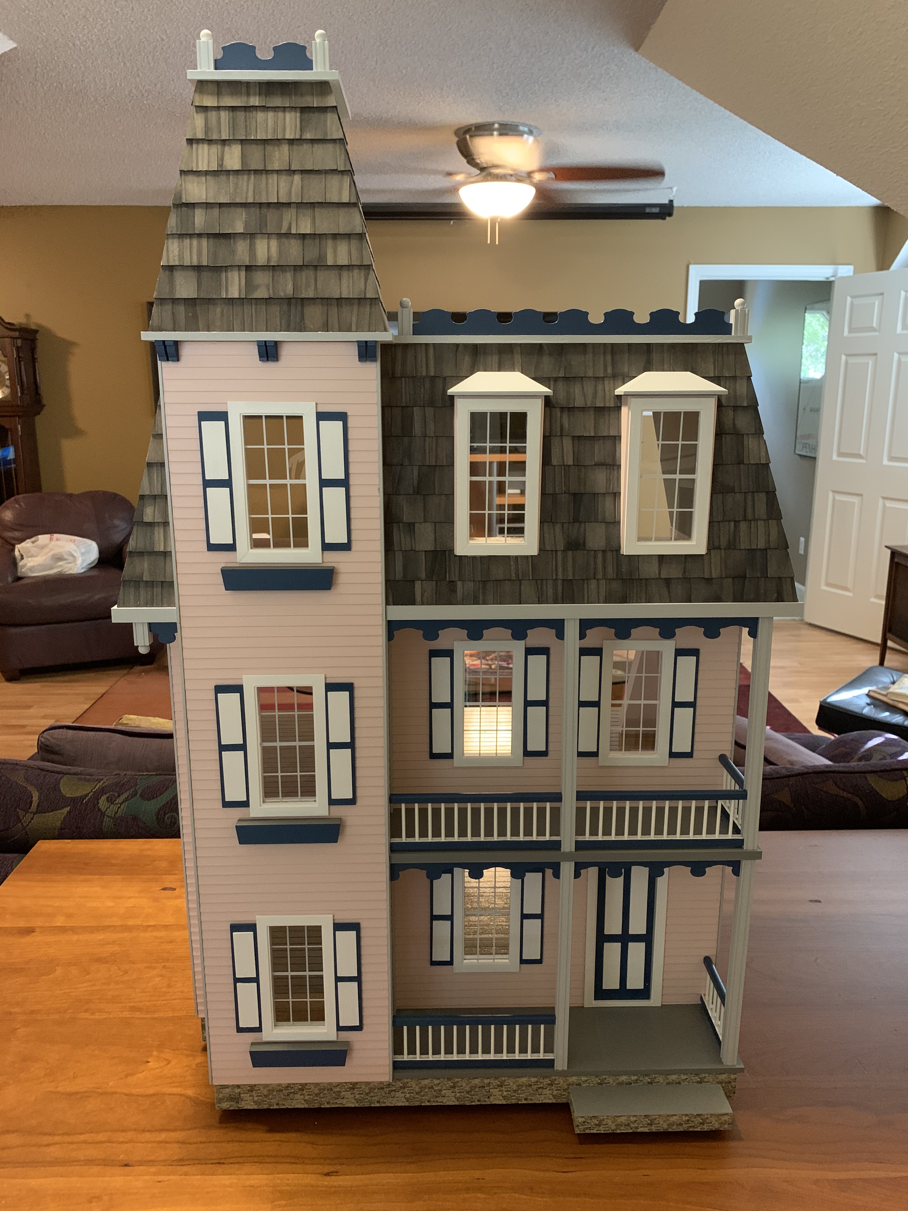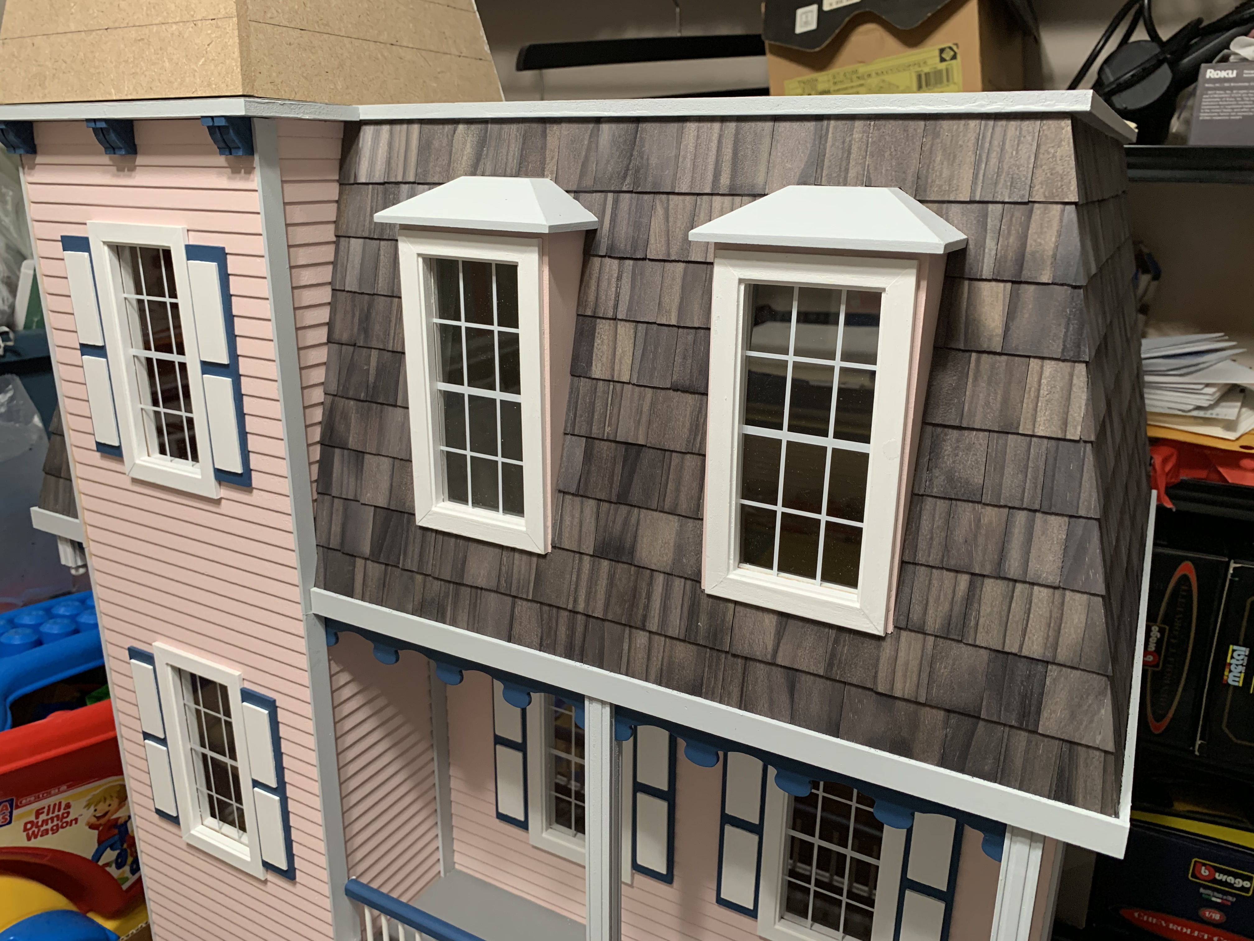 I completed the house by the end of May and so then needed to keep it hidden until Christmas. I knew it could not stay in its present cloistered location as my wife had already prevented our granddaughter from entering the playroom closet looking for games that were also stored in that closet. So, into a less used closet it went for safer keeping until Christmas morning when my granddaughter would excitedly discover it under the tree.