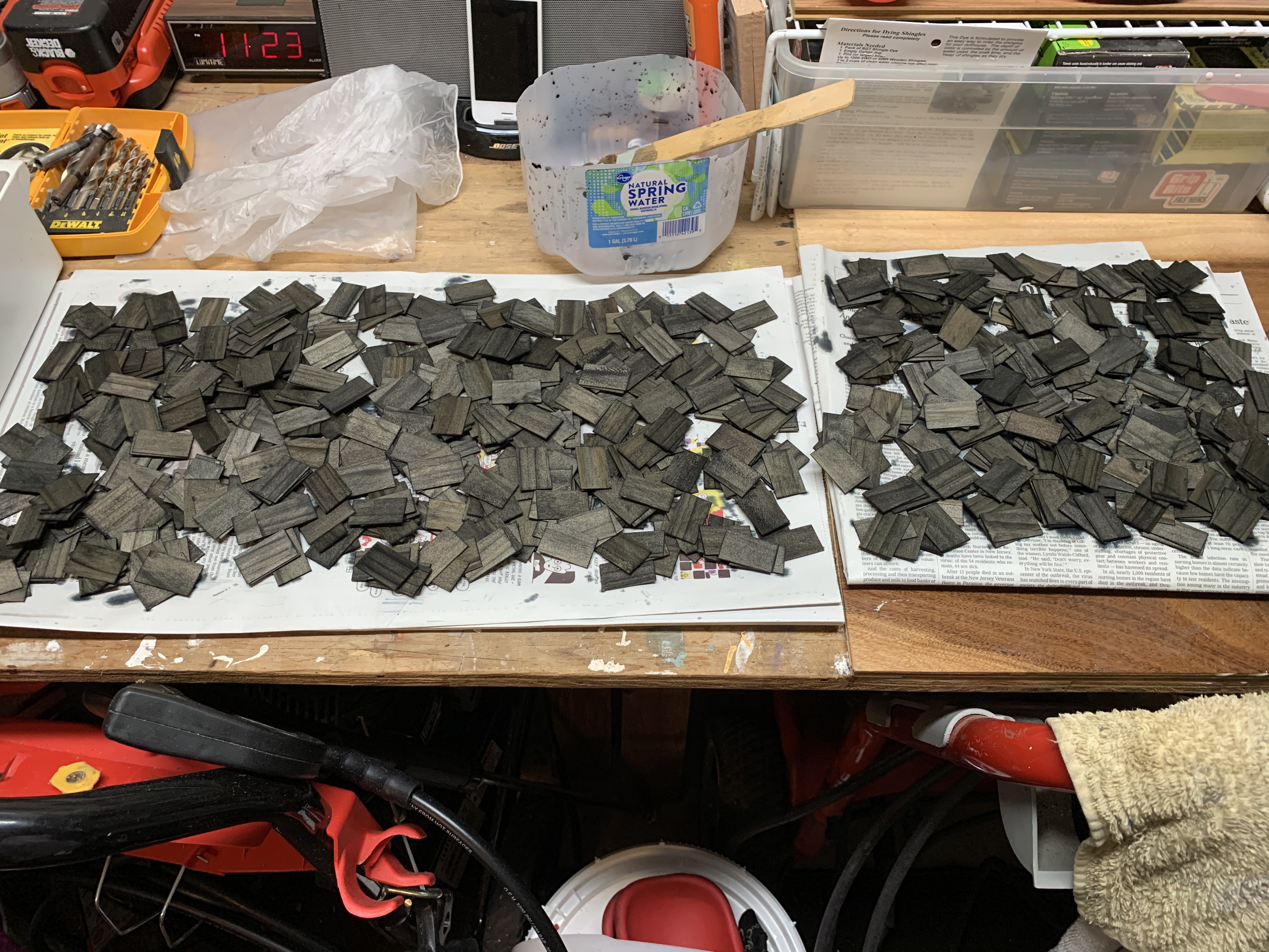 The dye I purchased was for staining them grey and mixed with water, it looked black. Reading the instructions, I was surprised at the number of steps involved over multiple days to get the desired finished color. Depending on the length of time the shingles were in the dye bath, the color would darken. As soon as I put the first ones in, I immediately got the color I wanted so I poured them into the milk jug funnel to separate them from the dye.