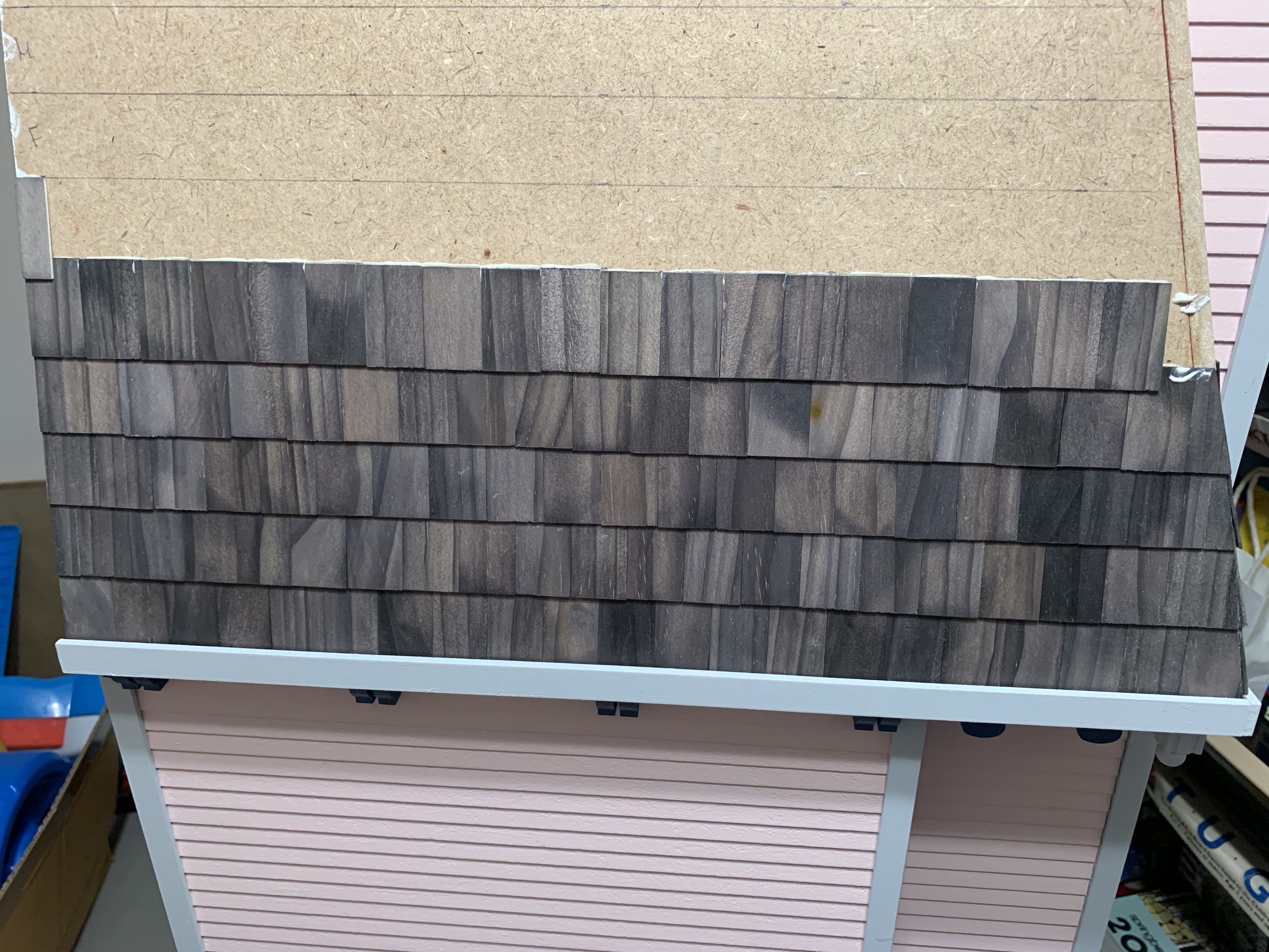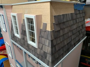 Progress along the sides went fairly quickly although I found if I tried to glue an entire row, some of the shingles would buckle as the glue dried. Therefore, I only did half a row at a time and to prevent the buckling, held the shingles in place with blue painters’ tape (seen in the top right of the photo above).