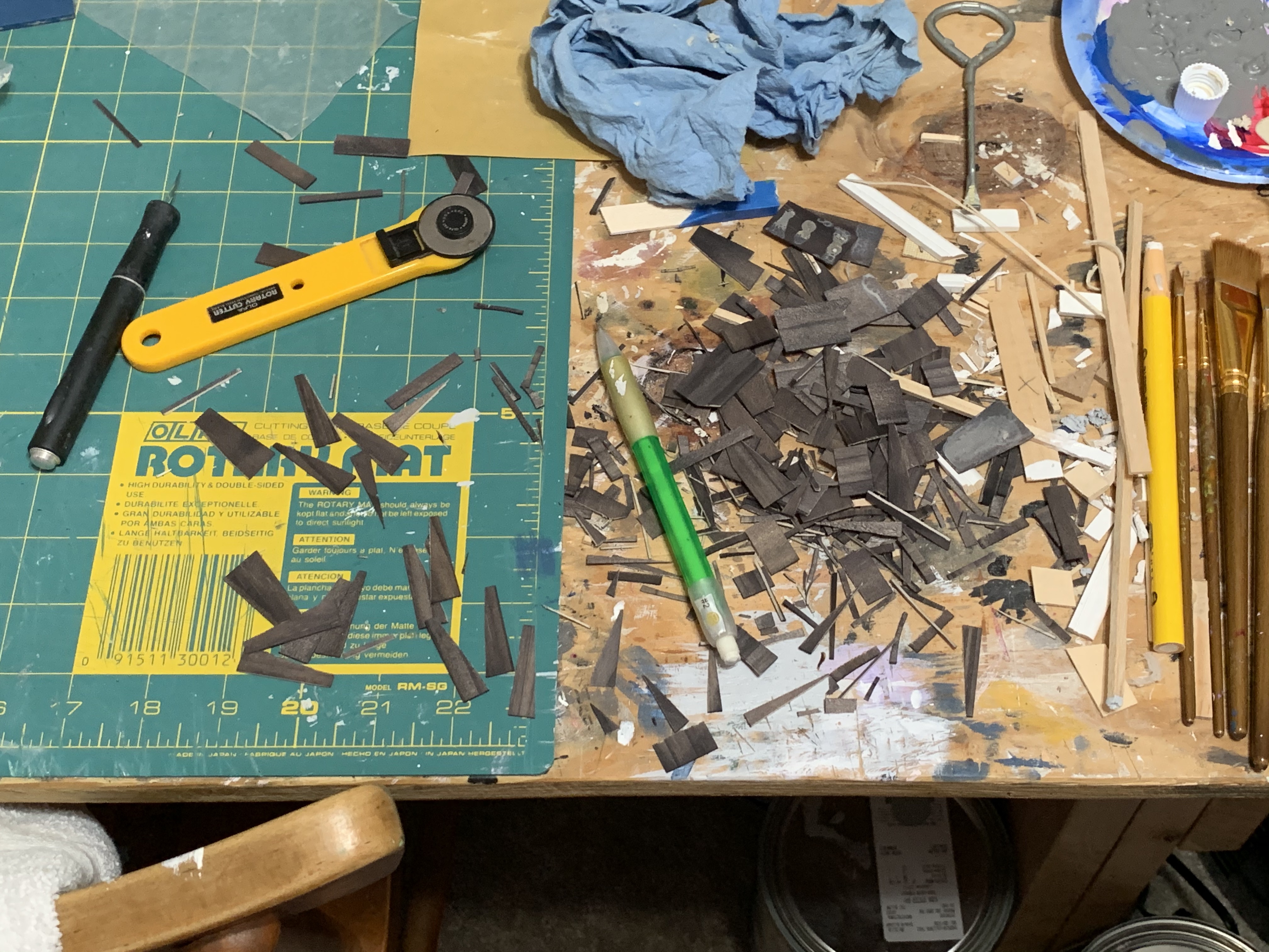 By the time I had finished gluing on the last of the shingles, I had quite a pile of scraps left over from all of my “trial and error” cuts.