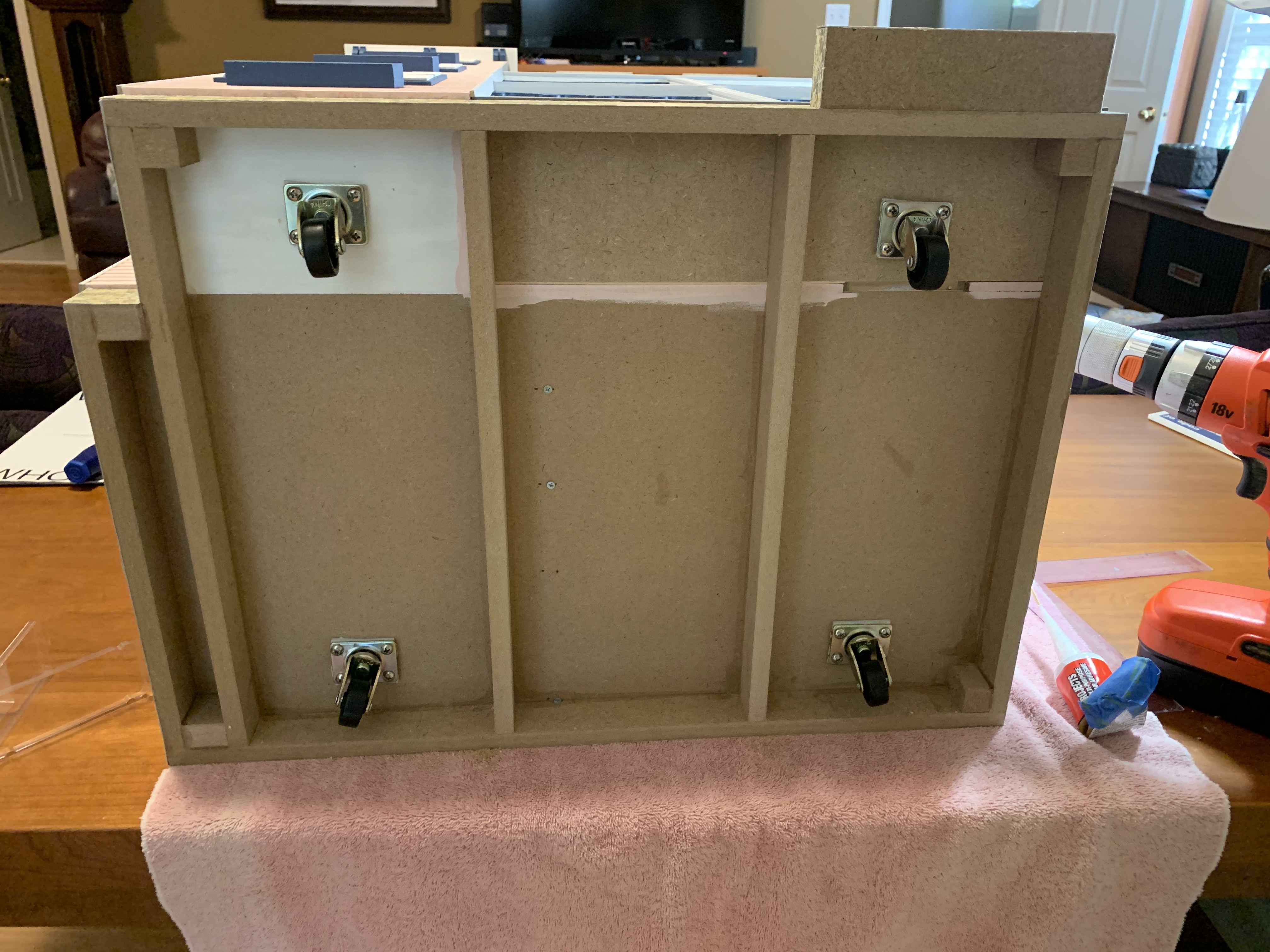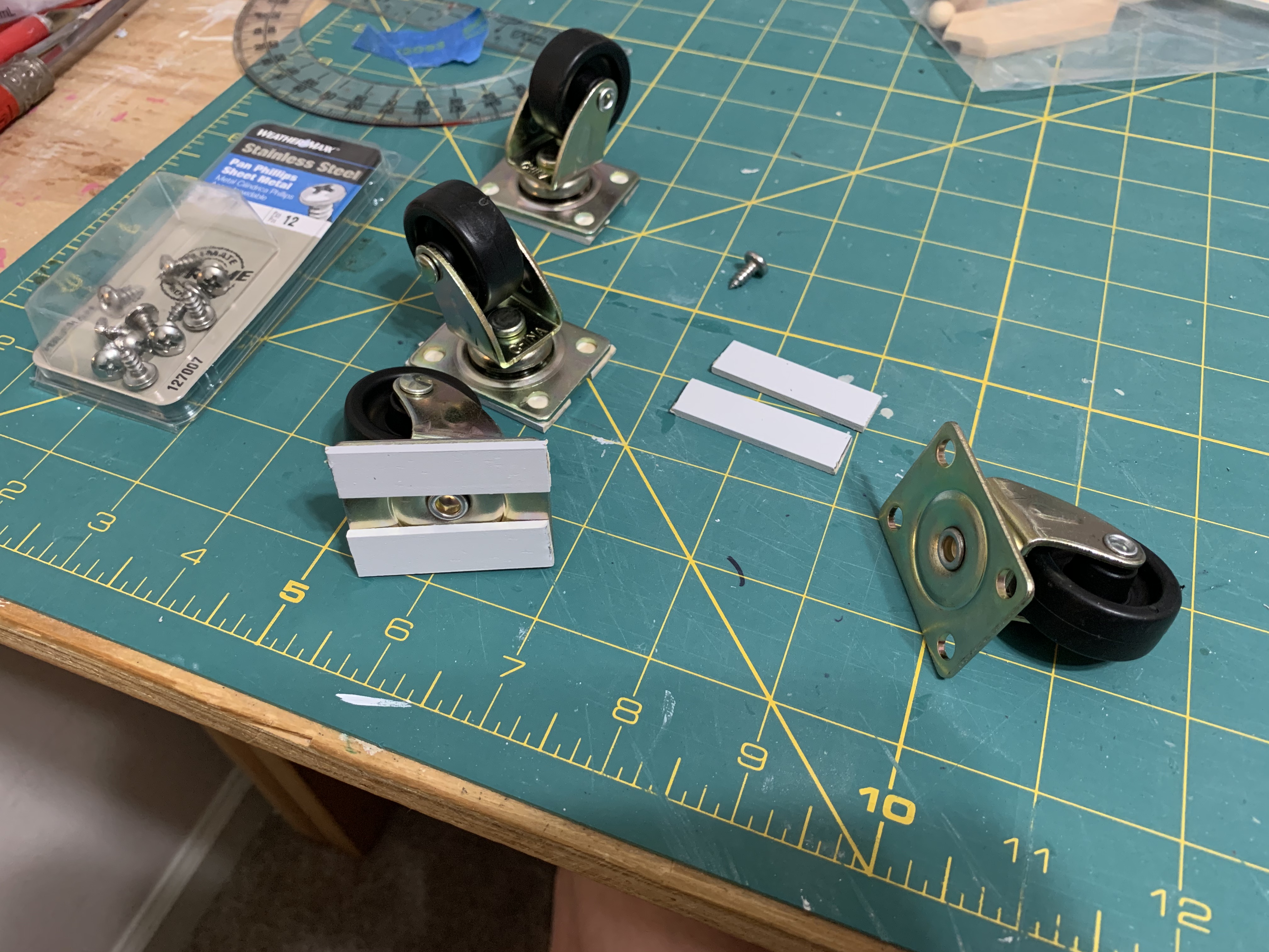 So, I came up with the idea of attaching small caster wheels under the foundation. The shortest length screws I could find were 3/8 of an inch so to ensure the screw threads did not come up through the first floor, I glued these small strips of wood to the wheels before gluing and screwing them to the foundation.