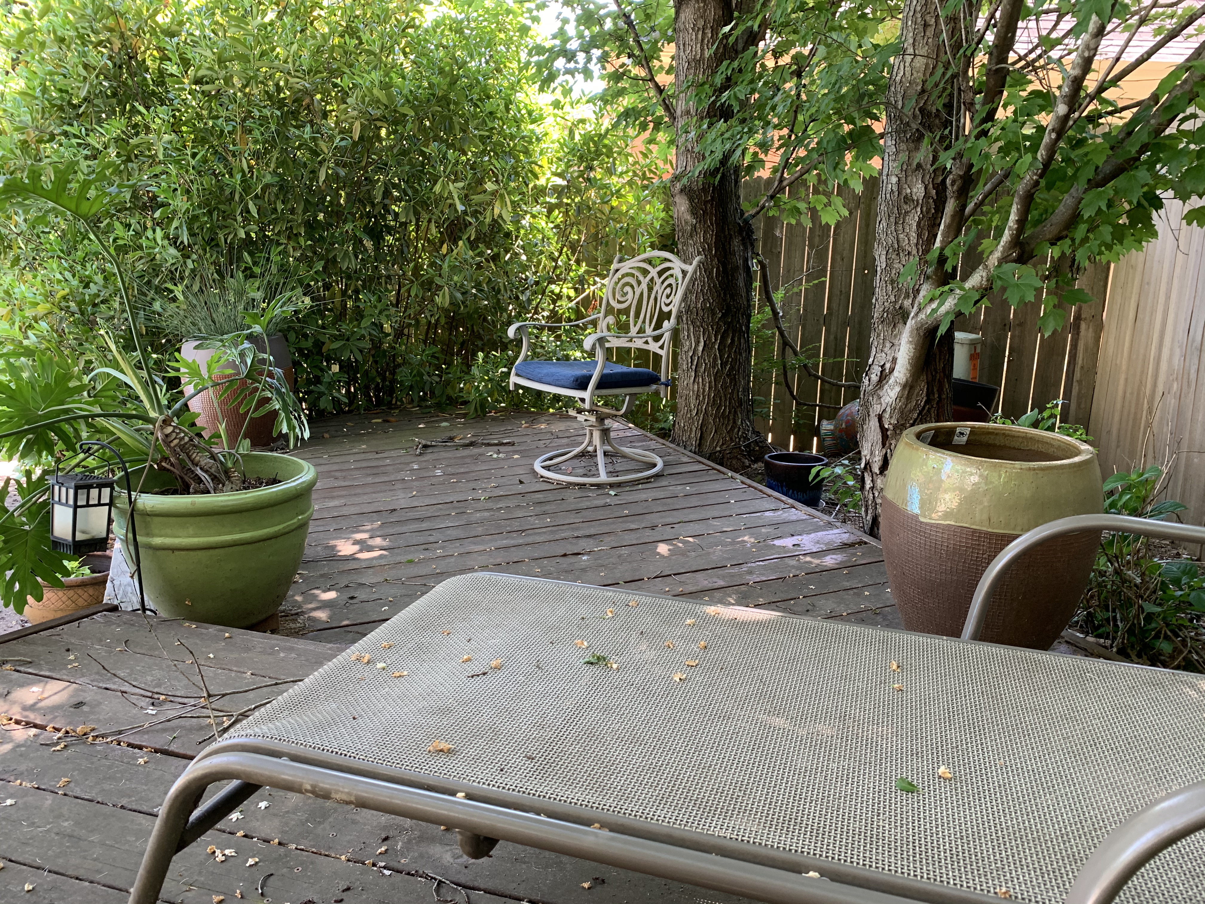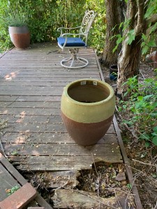 This tree root had grown all along the edge of the deck (seen here pulled back) like a hidden electrical wire. In fact, as I pulled it from its hiding place, I traced it all the way back to the backside of the deck where the boards had rotted beneath the planter. It had completely encircled the deck. This certainly explained the rotting of the boards along the edges as the root’s presence would tend to hold moisture in direct contact with the boards.