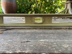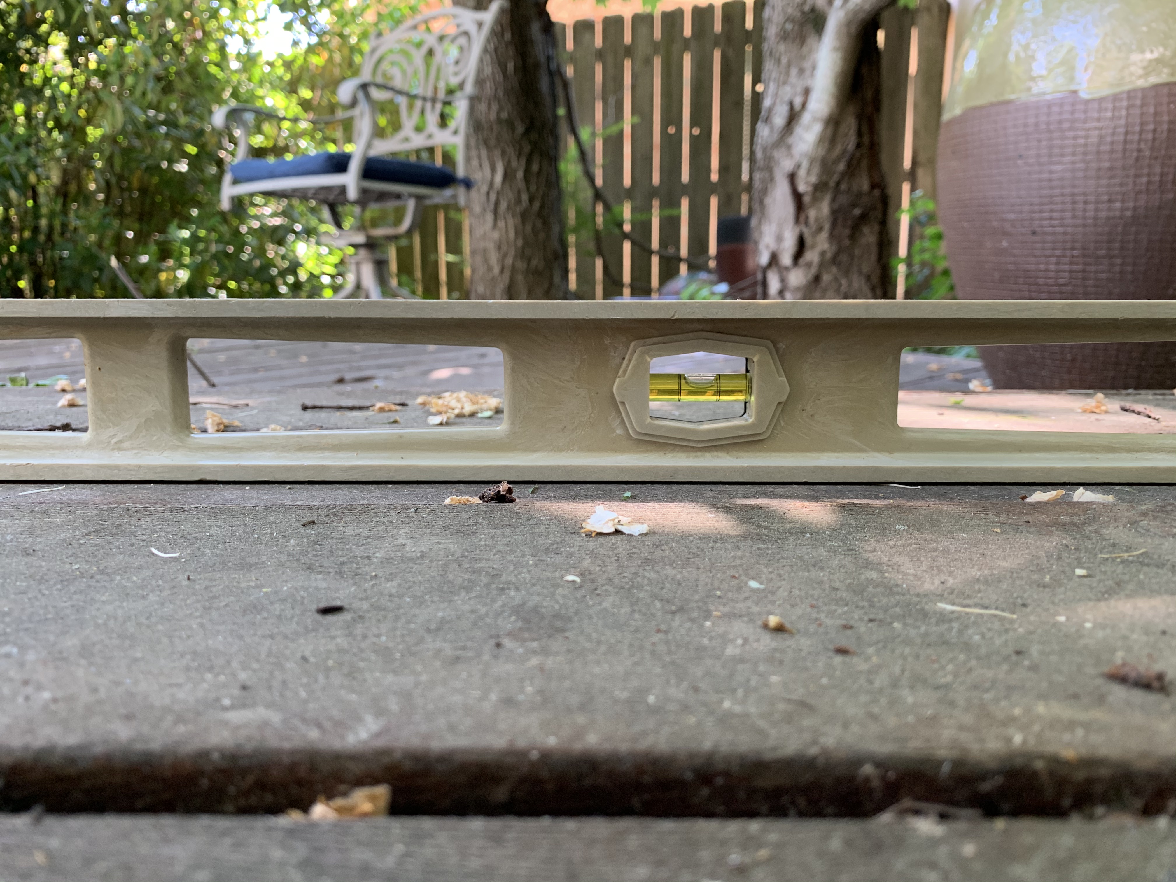 While sitting in these lounge chairs on the upper deck one spring evening enjoying an adult beverage with my wife, I looked over at the lower deck and for the first time noticed that the back of the deck was significantly elevated in relation to the front. I got up and noticed walking from the front to back that it felt a little akin to walking up the deck on a sinking ship. I got out a level and compared the upper to the lower deck.