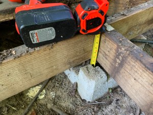 It seemed to make the most sense to start with a new joist in the back corner where the concrete block had become almost level with the ground due to soil washing under the deck over time. I briefly toyed with the idea of digging out and raising up this one support block but even shallow digs with a trowel uncovered tree roots that had grown all around the block. So, shimming would be the way to go.