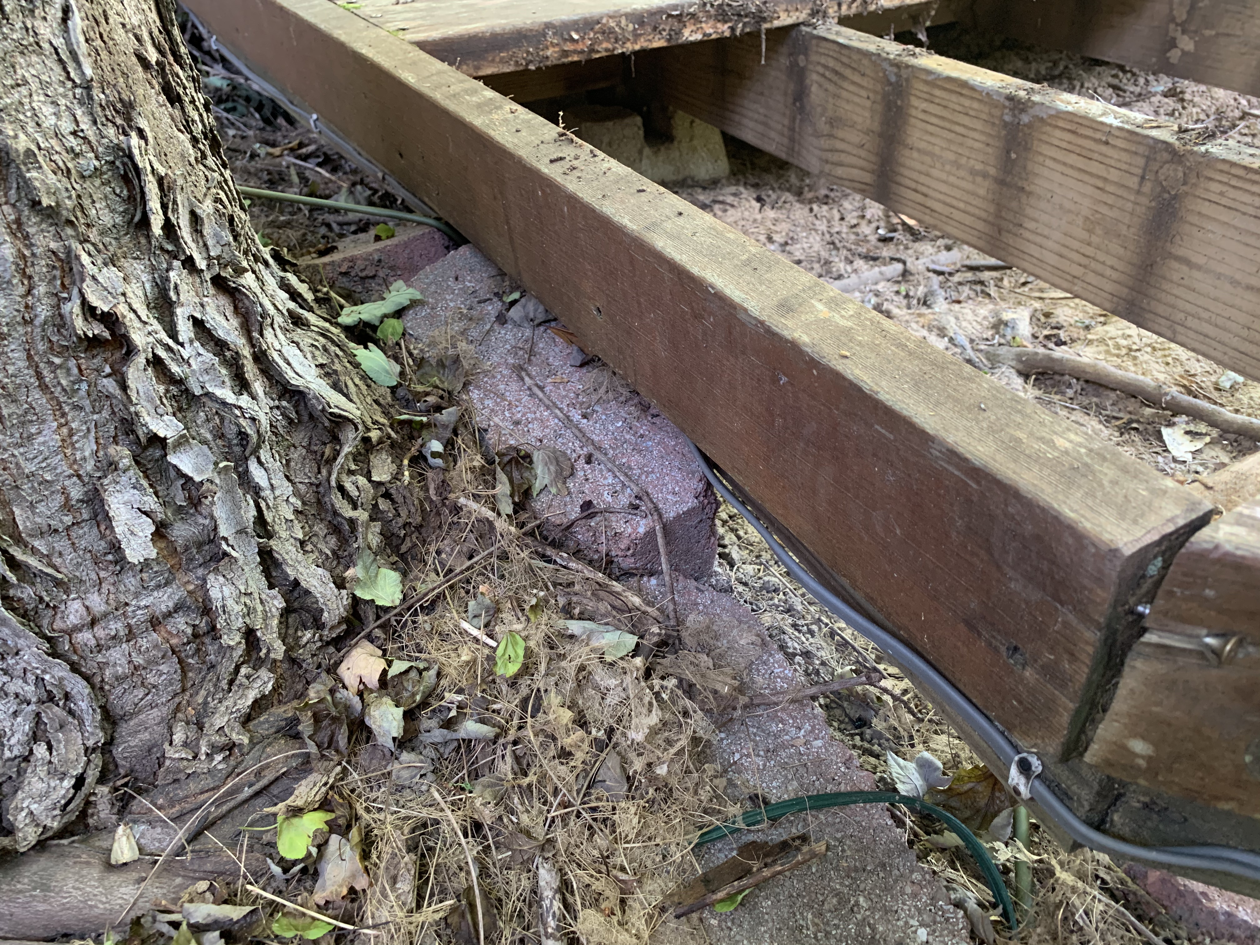 As I suspected, while the upper deck was still true plumb just like originally built, the lower deck was significantly out of kilter. Repairs could wait no longer and since I had finished my weeding/mulching earlier due to no travel this year, I had the time to focus on the deck.