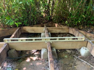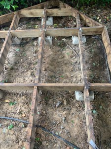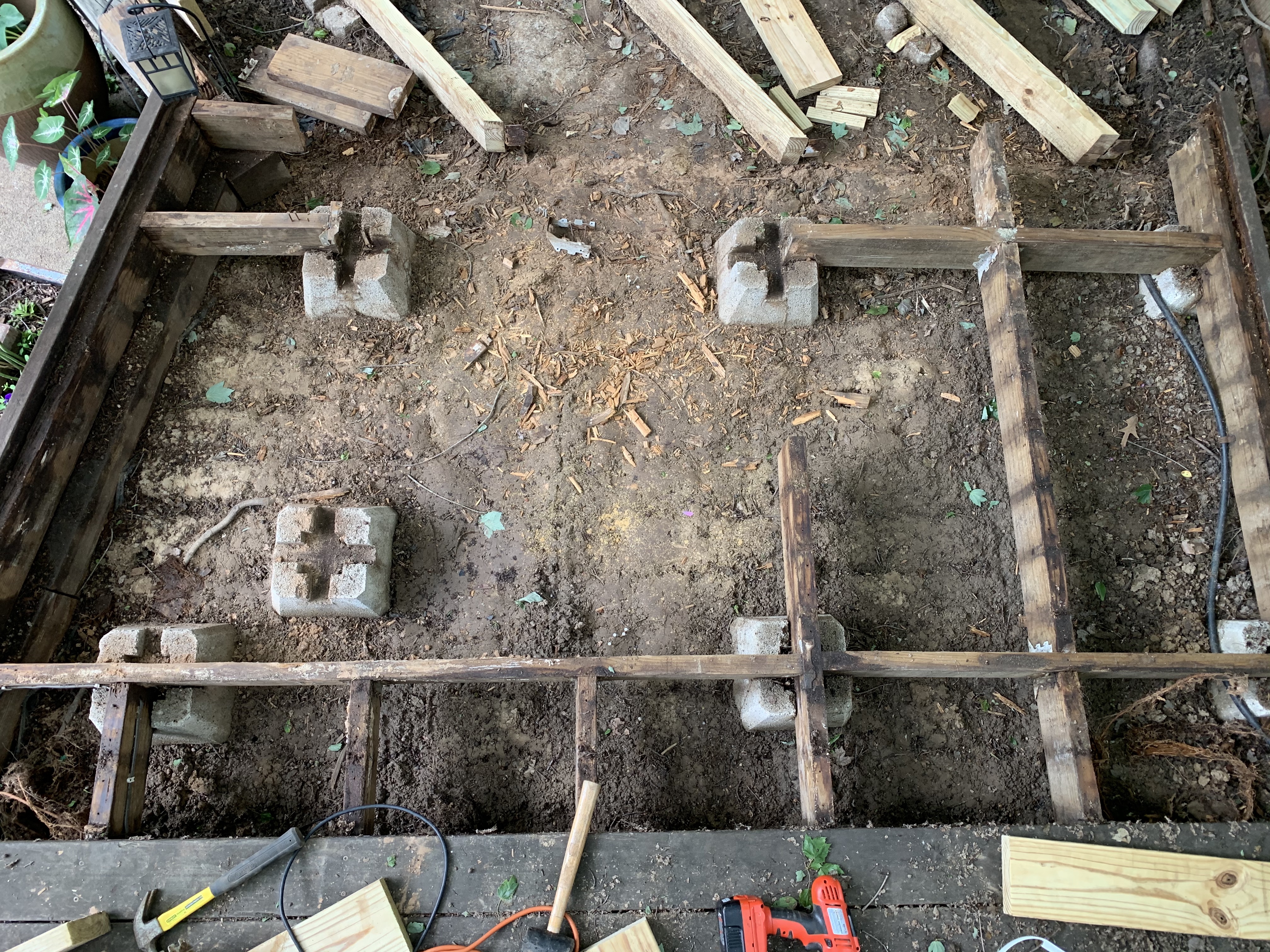 It took a lot of digging around the concrete blocks and banging the frame with a rubber mallet to once again get the joists seated into the slots on the top of the concrete blocks.